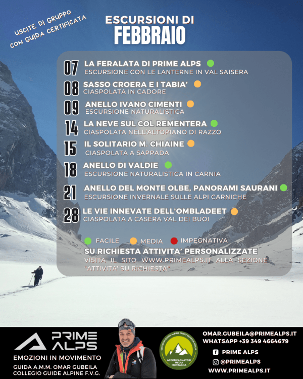 Eccoti un assaggio delle escursioni di febbraio assieme a me (quasi tutte..) Per maggiori informazioni ti invito a visitare il sito http://www.primealps.it della rete d'imprese si cui faccio parte oppure seguirmi su Facebook e Instagram sulle pagine di Ai piedi delle Carniche. Ti ricordo inoltre che è sempre possibile prenotare una visita personalizzata, in particolare... Continua a leggere →