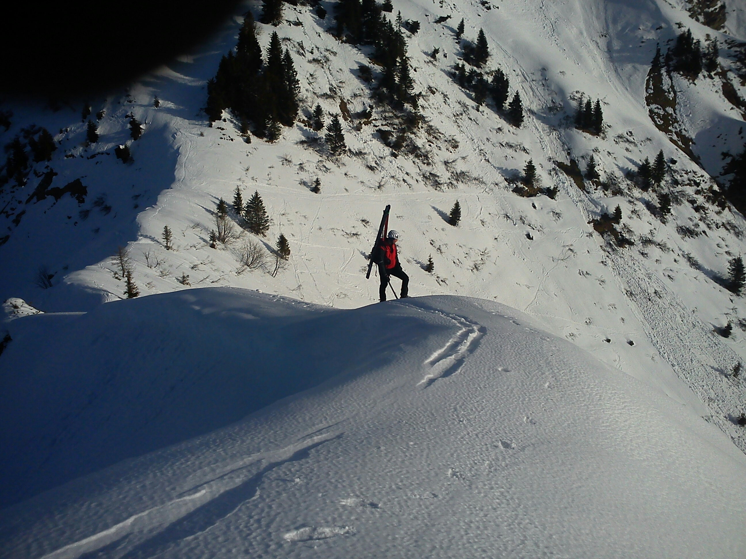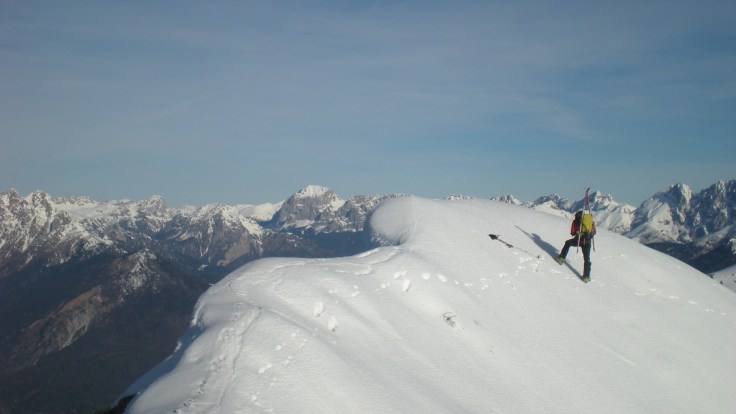 Si sta da Dio quassù. 2 chiacchiere con il Pelle e si decide di comune accordo di affrontare in discesa il primo canale dell’Arvenis verso il Tamai.. Quello principale risulta troppo svalangato per assicurare una bella discesa, e poi sotto finiremmo in mezzo ai mughi! no no, tanto la pendenza è pressoche la stessa. Così deciso inforco i miei nuovissimi Volk nero corvino e comincio a saltellare su una neve da urlo!