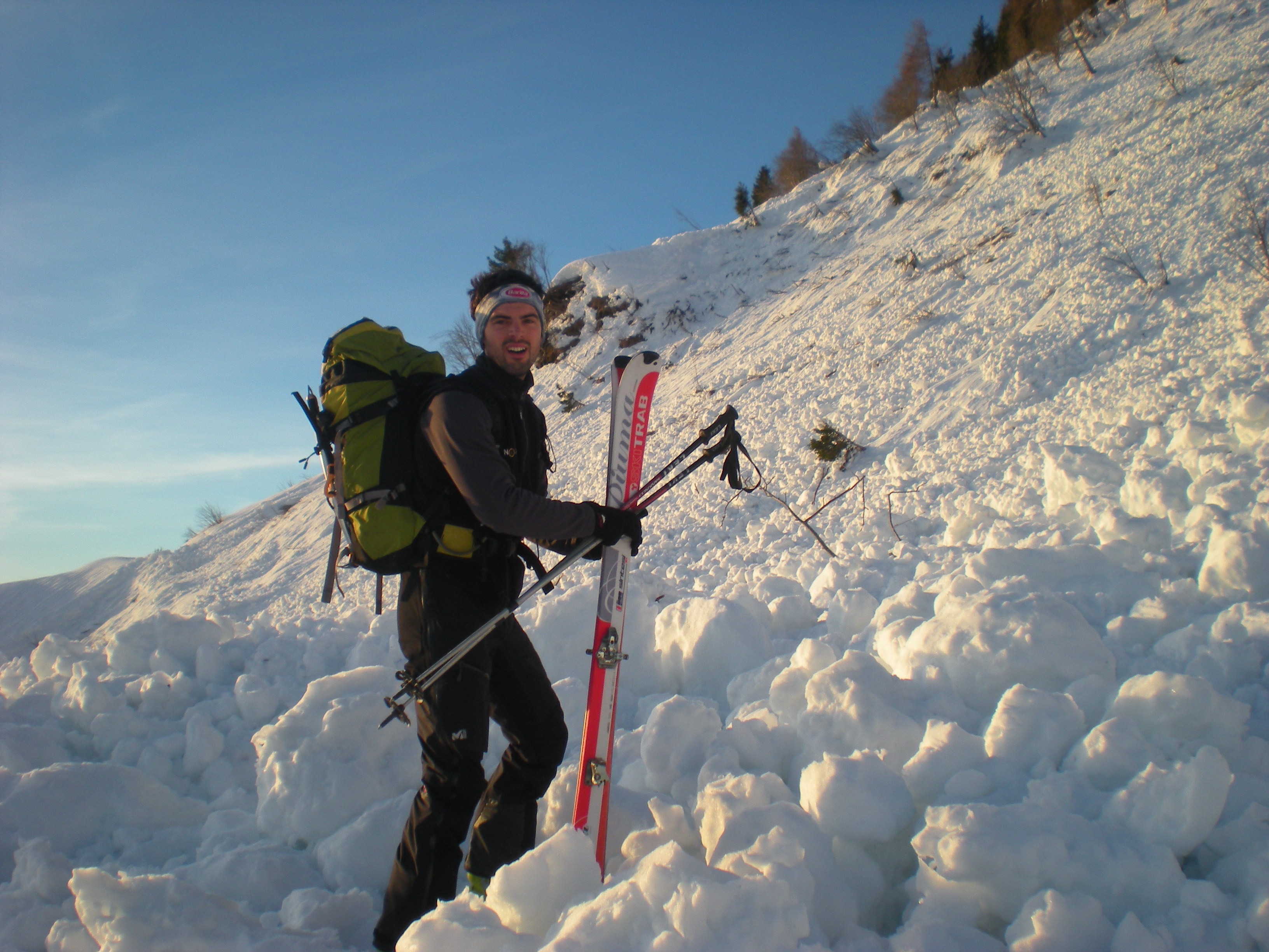 Fà già parecchio caldo. Raggiungendo malga Tamai notiamo i pendii dello stesso monte martoriati da valanghe di spropositate dimensioni. Per attraversare una di queste siamo costretti a togliere gli sci e districarci fra blocchi ghiacciati e ramaglie varie trascinate a valle dalla forza della natura. Penso che passare di qua dopo le 10 non sarebbe bello!