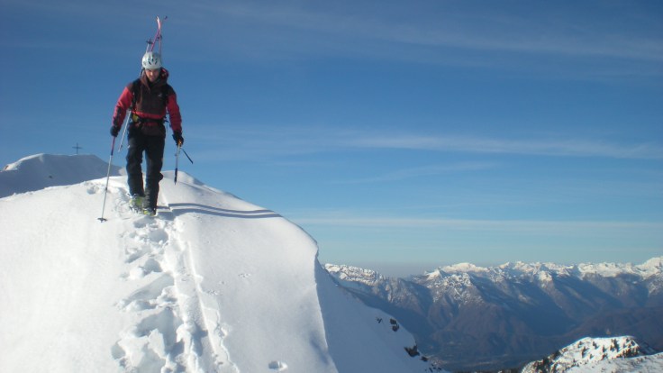 Sotto alla forcella che collega Tamai e cresta dell’Arvenis il csole comincia a scaldare decisamente, bisogna fare presto per non rischiare di trovare una pappa insciabile dirante la discesa agognata. Calziamo i ramponi e, messi gli sci nello zaino, con fare da “veri” alpinisti ci mettiamo in marcia mirando alla cima dell’Arvenis. Il tracciato ora passa sul versante N dove il clima cambia completamente: freddo, neve addirittura farinosa e poco assestata. Valuto il da farsi e decido che comunque un traverso risulta già tracciato da qualche altro sciatore (probabilmente Celso).. Ricalcandone alla perfezione le orme siamo fuori da eventuali pericoli e riguadagnamo il filo di cresta.