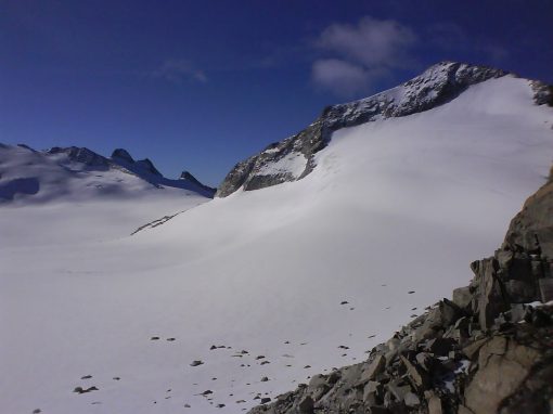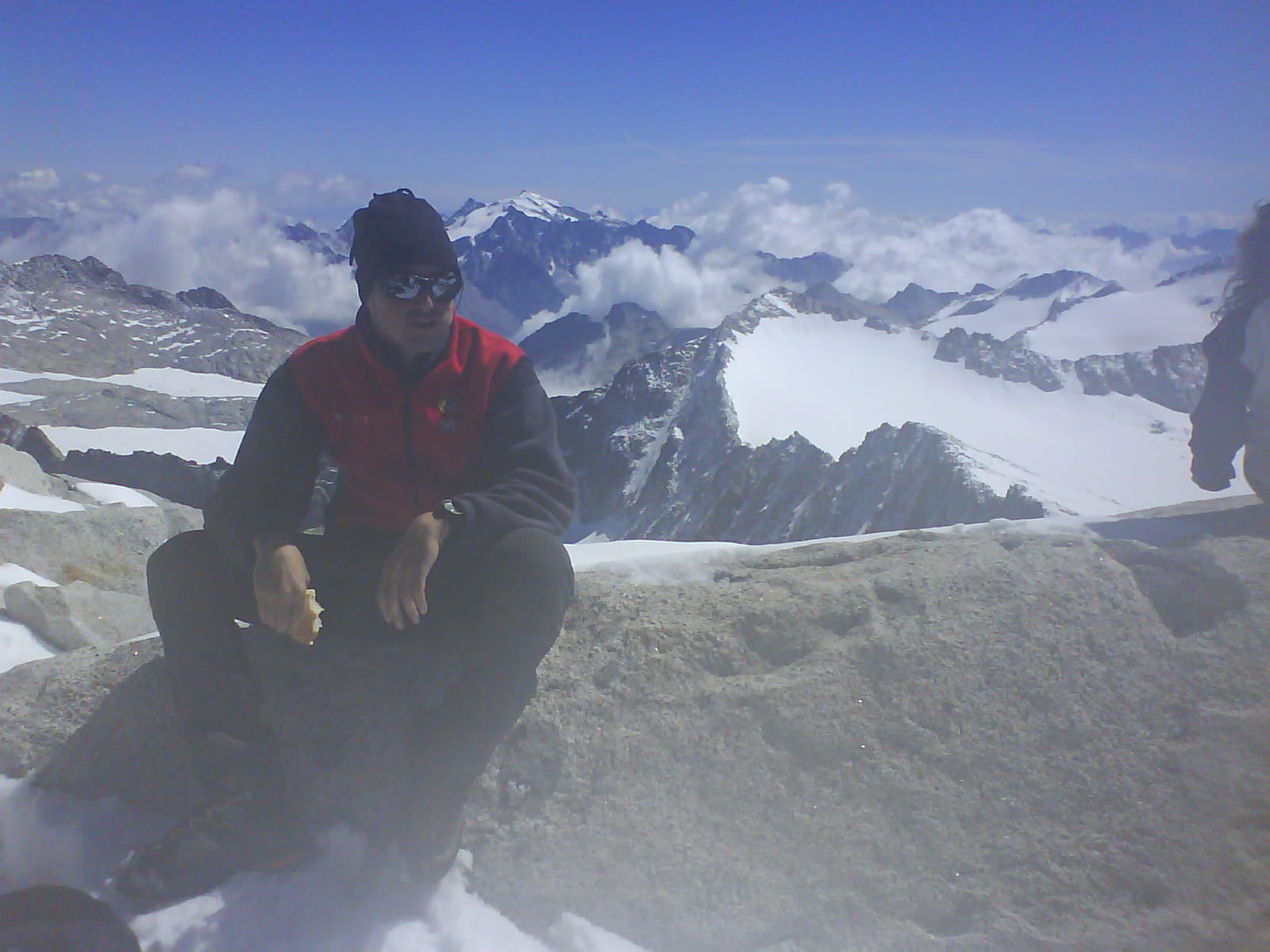 Il sole picchia! Per non ripetere l’esperienza ustionante (II° grado al volto) del M.te Rosa di un anno fa, mi metto la crema solare ogni 15 minuti. In 2 ore di marcia spedita siamo nei pressi delle rocce basali della parete S. Molliamo le corde con cui siamo legati per i vari crepacci e cominciamo la salita dello spigolo finale di granito. Destreggiandoci tra neve e blocchi di granito guadagnamo la cima che troviamo in ottime condizioni – quota 3539m. Bellissimo, panorama mozzafiato verso tutta la catena del Cevedale Ortles e Dolomiti. Un sogno.