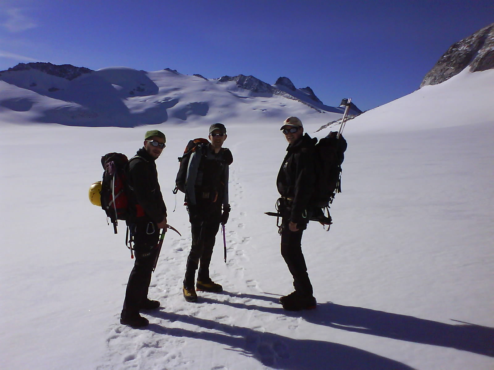 Il rientro è penoso in quanto l’ulteriore aumento della temperatura scioglie la neve e ad ogni passo si sprofonda fino alla caviglia, ci sorbiamo così i 6 km di ghiacciaio nelle pozze. C’è anche chi trova il tempo di fare i propri impellenti bigogni in mezzo a km quadrati di neve.. : il Pelle! Piazzato lo zaino a protezione fa un buchetto nella neve e mentre si accinge allo “sforzo” sbuca giusta una cordata da dietro l’angolo! ahaha Morire dal ridere 🙂