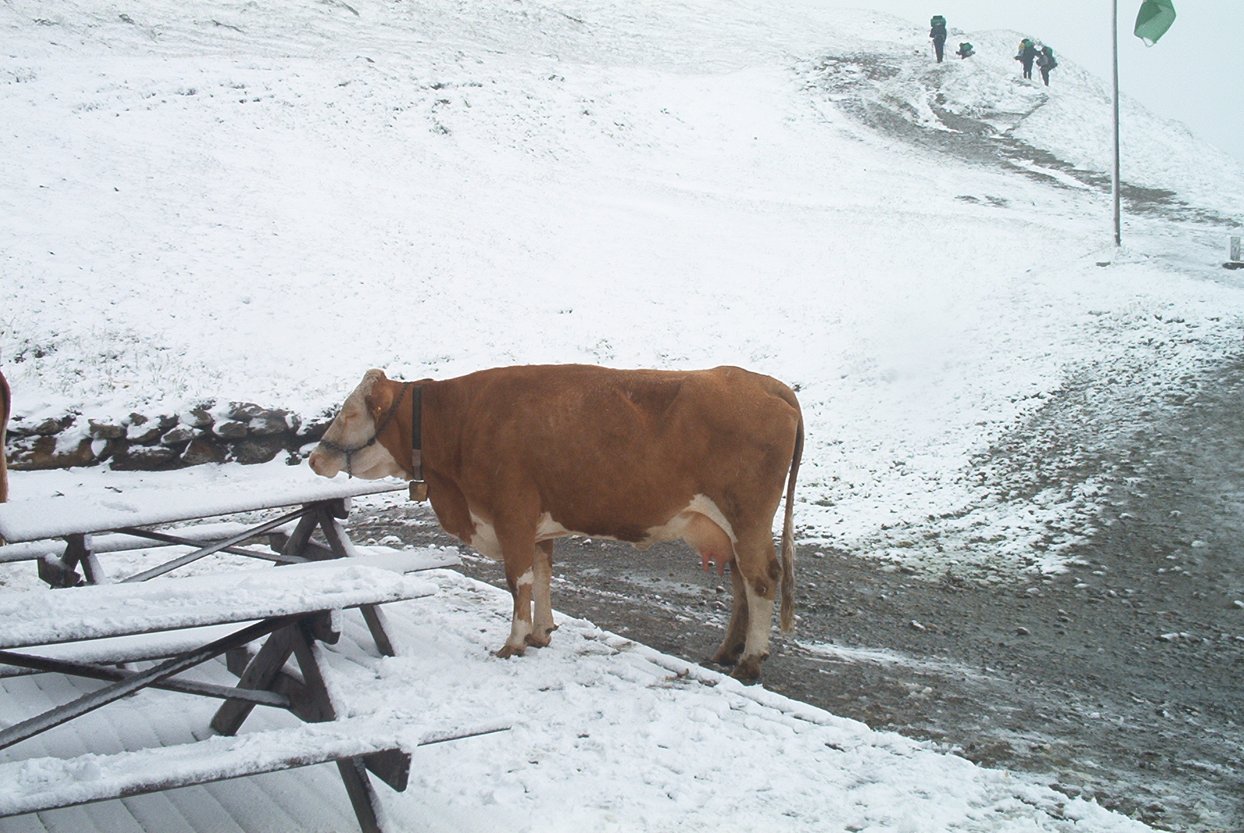 E’ tutto bianco intorno e perfino le vacche si sono messe sotto vento per ripararsi. Nel rifugio mangiamo cioccolato e abbozziamo una conversazione in tedesco con dei trekkers, quanto basta per capire che anche loro vogliono dormire al Obstannersee Hutte. Dobbiamo fregarli e arrivare prima di loro visto che non abbiamo prenotato. Guido io la comitiva. Ora è tutto un susseguirsi di creste e forcelle, sentieri ingombri di neve fresca, si scivola alla grande.
