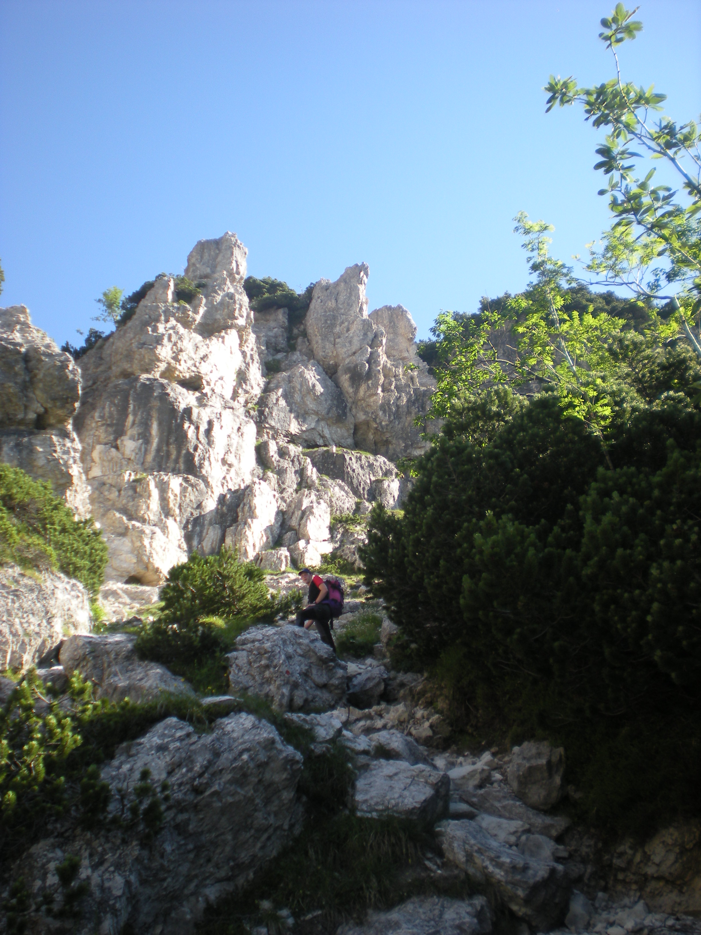 La discesa si rivelerà infinita e dura.. Passaggi di 2° esposti per arrivare alla focella, poi risalita su ferrata e lunghissima discesa – a secco totale. L’acqua si sednte scrosciare giù nel fondovalle. Arsura. Le radici dei mughi sembrano prendere fuoco..
