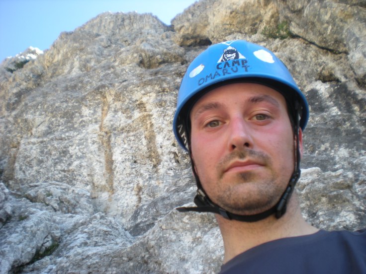 Con il 5° tiro Cristian raggiunge i mughi verso l’uscita sull’antecima, recuperato il sottoscritto in breve raggiungiamo il punto più alto. Salita fatta in circa 2.30h di arrampicata tranquilla. Panorama splendido. Sgranocchio 2 biscotti.