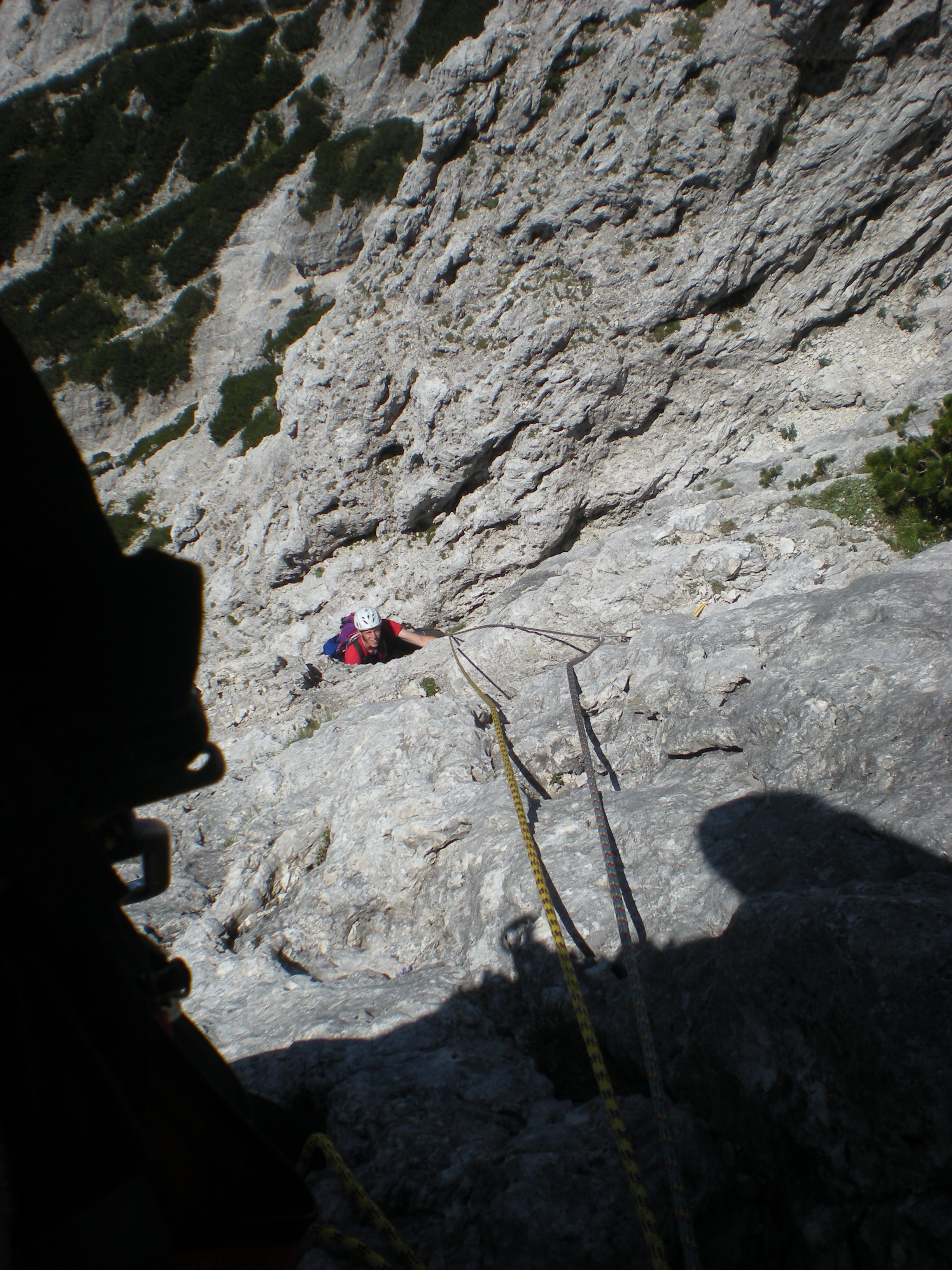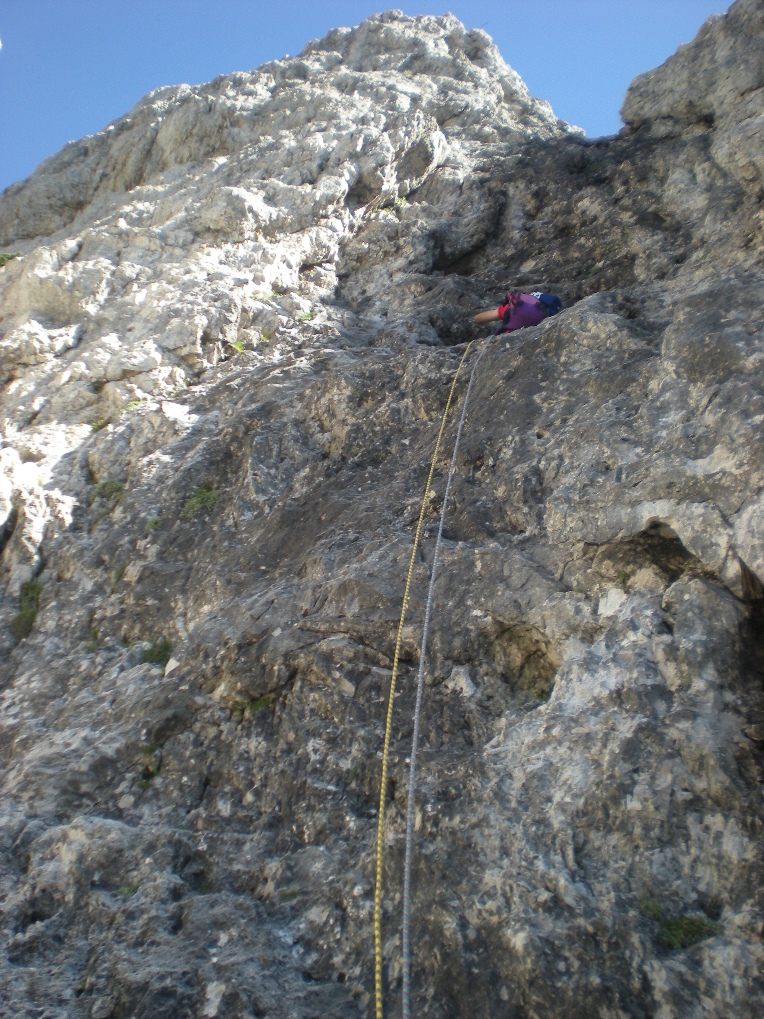 La seconda lunghezza tocca a mee pare sia quella più difficile dell’intera via, dato IV°+. Trovo dei vecchi chiodi nei punti più impegnativi, vengo messo alla prova per la verticalità della parete ma le difficoltà non sono eccessive..