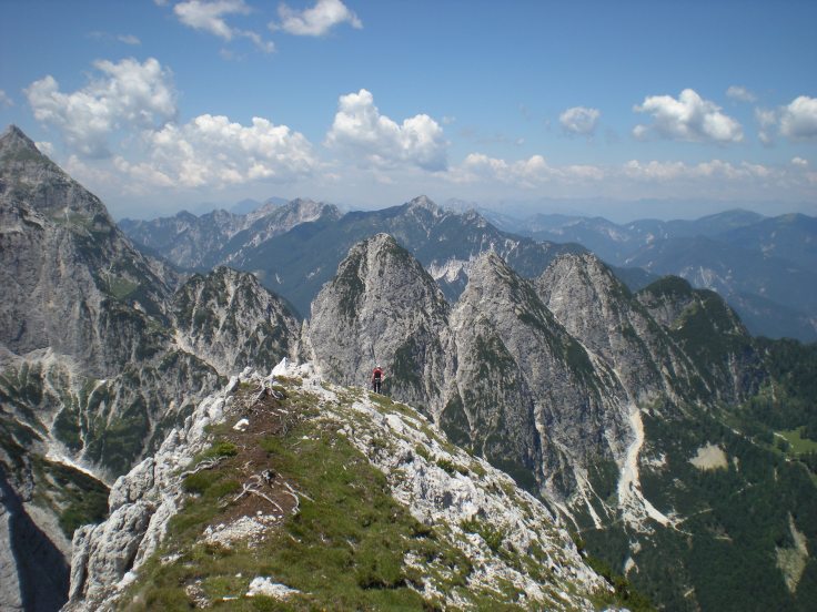 Oggi con un caldo africano attacchiamo la direttissima alla cima delle cenge, una via data come tra le più belle delle intere Alpi Giulie. Assieme a Cristian in 1.20h siamo all’attacco della parete.. Diciamo che dal bivacco Brunner mi tira decisamente il collo… Recupero un pò di fiato solo nella parte finale dell’ascesa verso la parete dove tocca arrampicarsi su tracce di sentiero con qualche passetto di arrampicata non difficile.