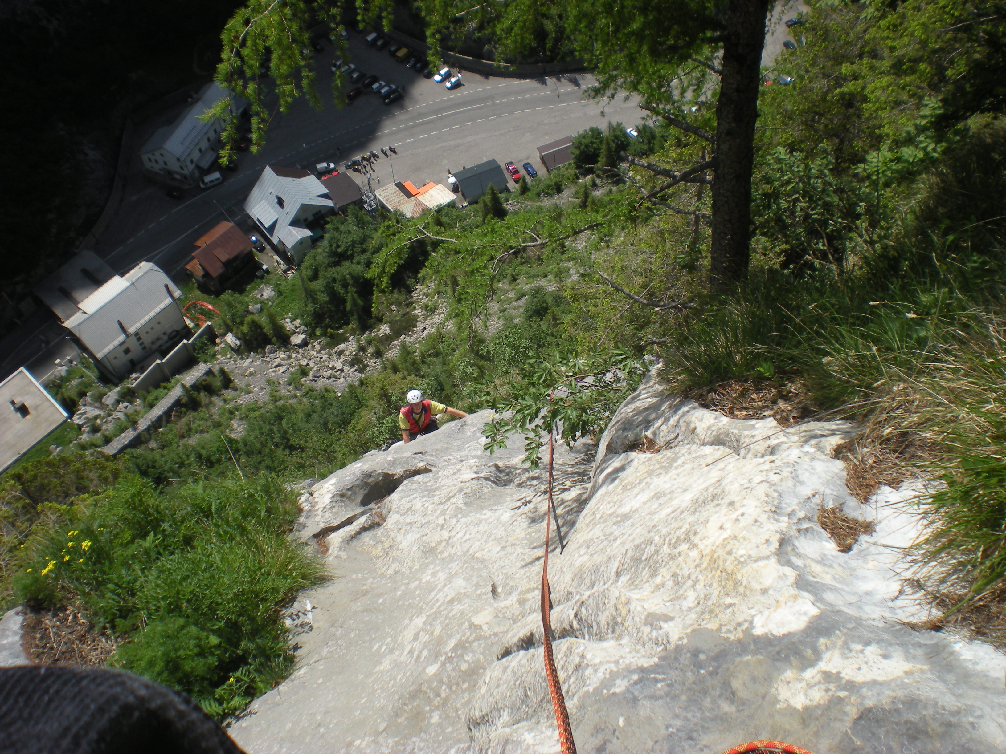 1° tiro: è la lunghezza più impegnativa della via “classica”. Per placche lavorate si arriva ad un singolo di 5c che va un pò studiato (se non ricordo male c’è un buchetto sulla dx che risolve tutto), poi facilmente alla cengia sovrastante dove si sosta sugli alberi con un cordino (non presente).