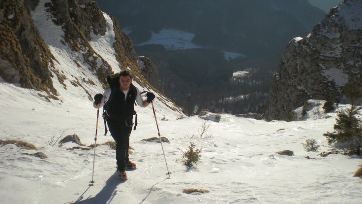 Partiamo di buon’ora da Sella Chianzutan e decidiamo di salire il canale dell’Agarat, varco naturale di scolo delle valanghe della sovrastante zona di casera Val. Ci dirigiamo quindi verso casera Mongranda, ad Ovest, e prendiamo la carrareccia che si alza nel bosco. La neve è dura, perfetta per continuare spediti anche senza i ramponi. Dove la strada intercetta il ruscello di scolo del sovrastante canale lasciamo la strada e cominciamo a risalire in direzione della nostra prima meta.