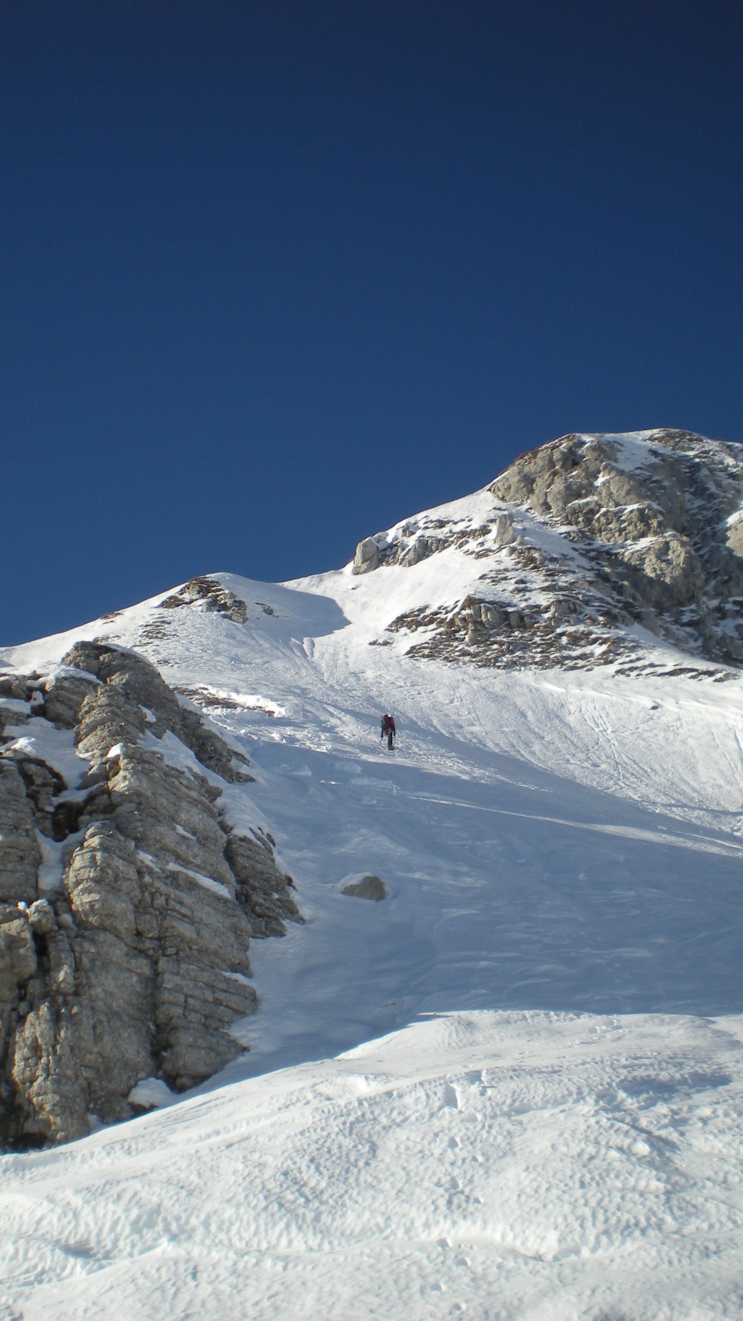 All’attacco del canale mettiamo i ramponi, qualche tratto di ghiaccio nascosto sotto ai blocchi delle valanghe lo impone. Spunta il sole ad illuminare quella che sarà una giornata splendida. Il gruppo si sfilaccia, chi corre di più si allontana, chi è meno spedito chiude il gruppo, io mi perdo a guardare lo spettacolo che si apre ai nostri occhi man mano che saliamo. Le difficoltà non sono mai eccessive, la piccozza non serve, usiamo i bastoncini per equilibrarci, stando attenti a non inciampare sulle punte dei ramponi! In cima al canale il caldino che si prospettava cede velocemente il posto ad un vento freddo che scende dalle cime, giriamo anche versante mirando alla prima punta, quella del Pizzat, la più alta del gruppo.