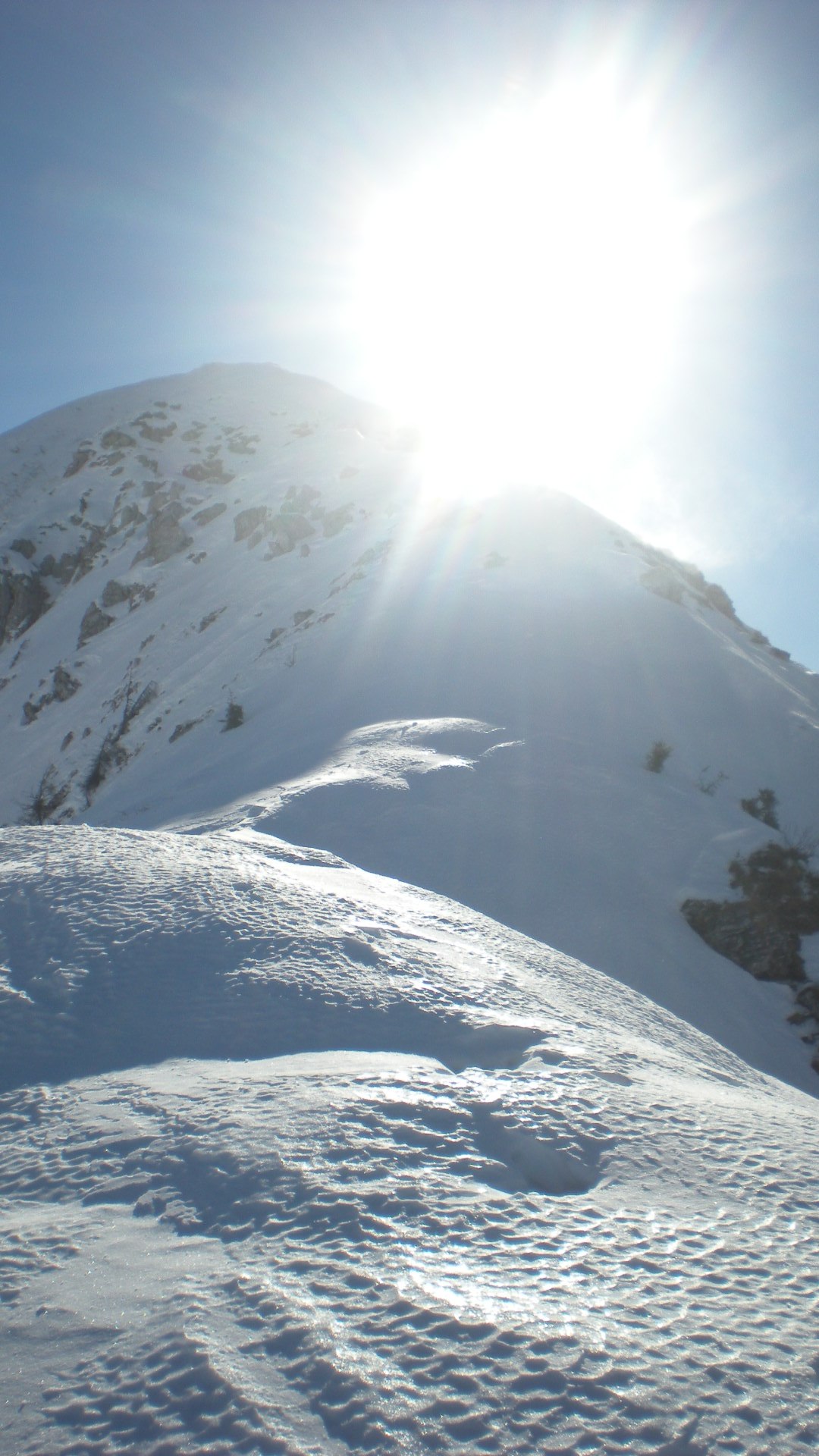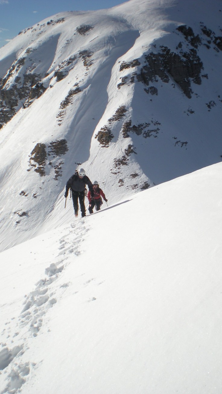 Seguiamo l’evidente cresta ora verso N, arrivando al passaggio forse più pericoloso dell’intero giro: l’attraversamento di un’aerea forcelletta.. Ci assicuriamo velocemente con la corda ma le manovre portano via comunque qualche minuto.. Tanto basta a congelarmi un ginocchio nella neve! Passo oltre e corro verso il sole, lascio indietro anche gli amici.