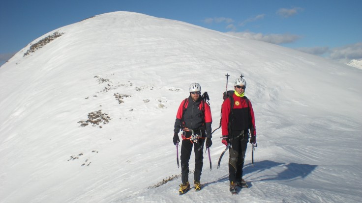 Seguiamo quindi la cresta verso la cima, in un’euforia in aumento alla vista del panorama circolare che si offre ai nostri occhi. Siamo in cima sotto un vento freddo e sferzante.