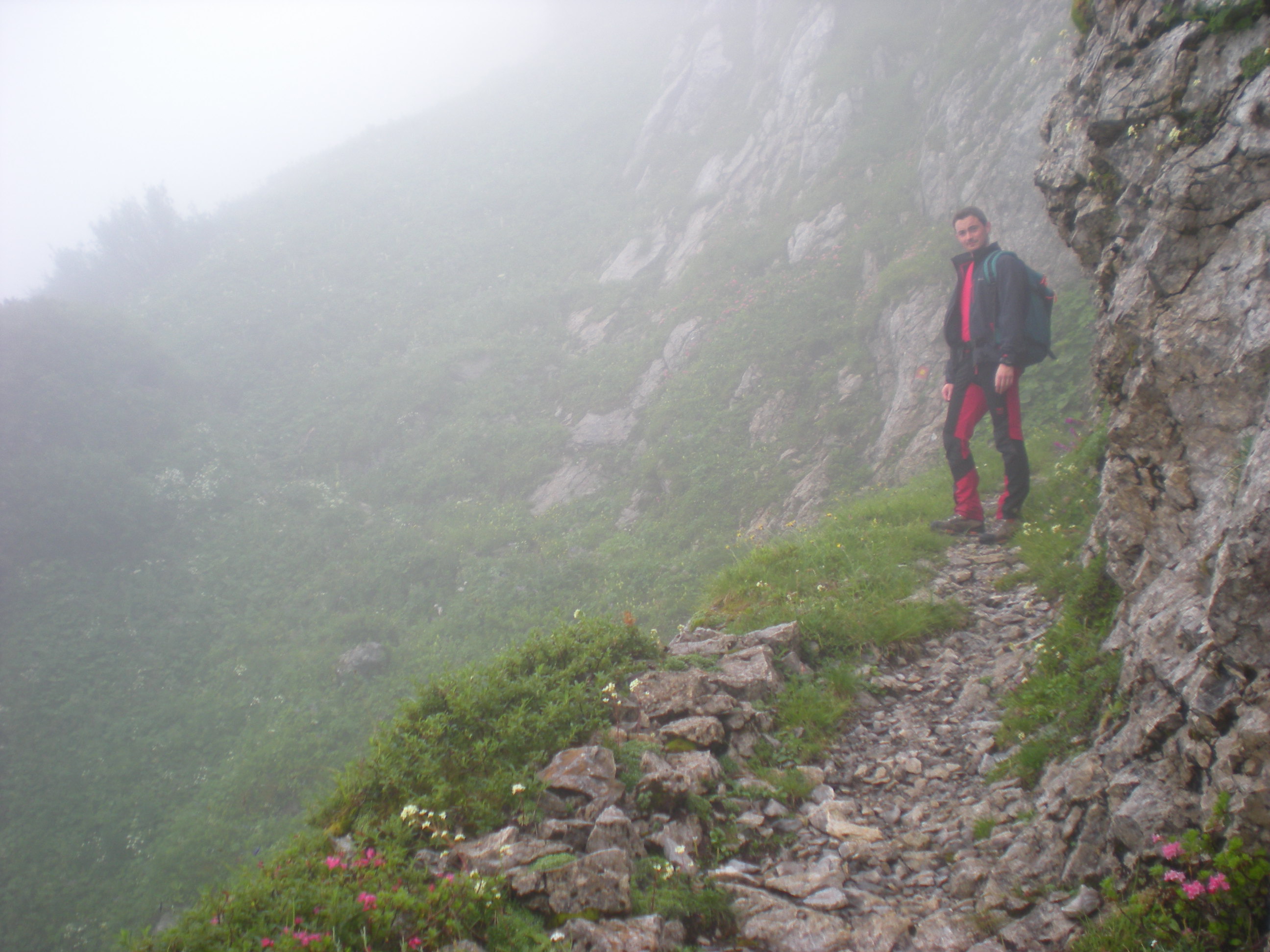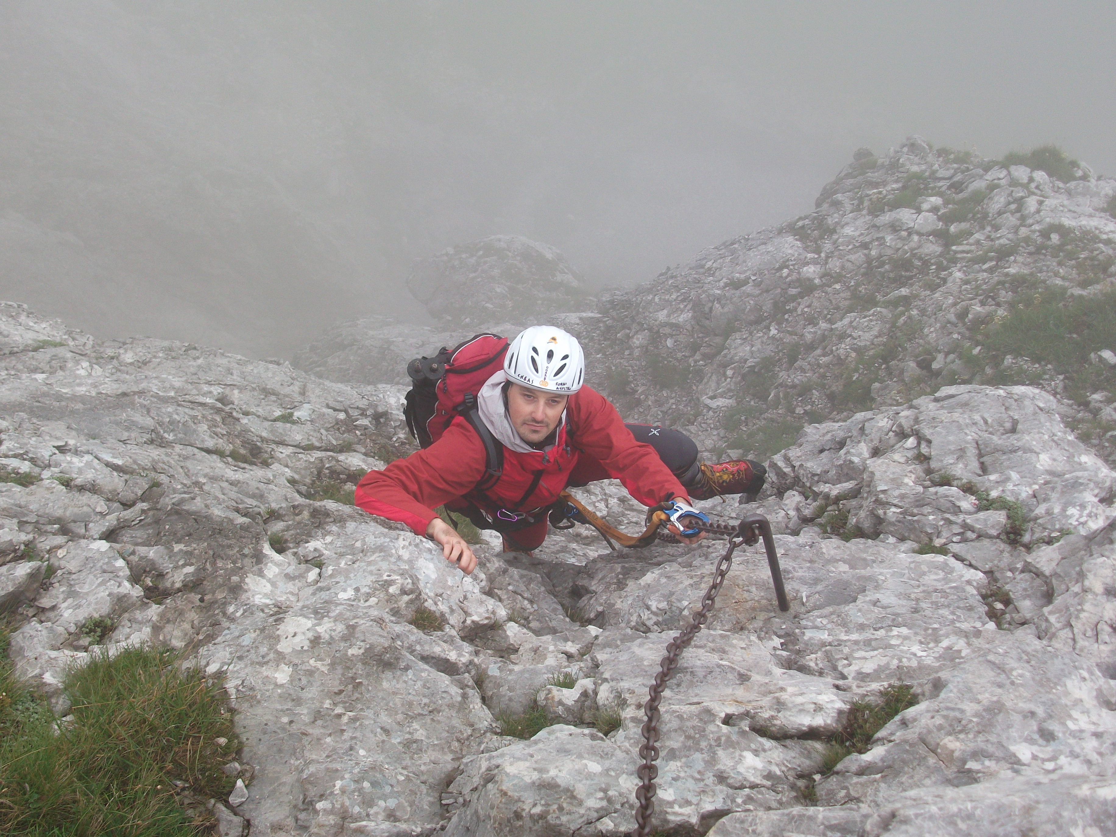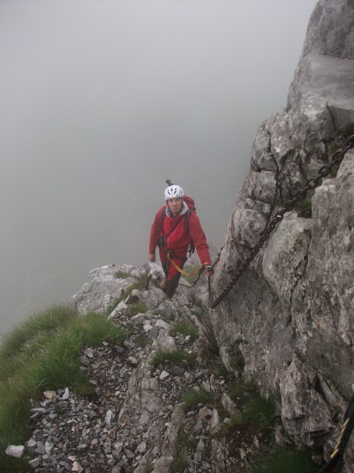 Oltre la scaletta il percorso si snoda su rocce più o meno esposte e passaggi anche carini. A portare sicurezza una bella catenozza un pò lasca in certi tratti, che ostacola non poco lo scorrimento dei moschettoni. Panorama poco o niente, nuvoloni tanti.