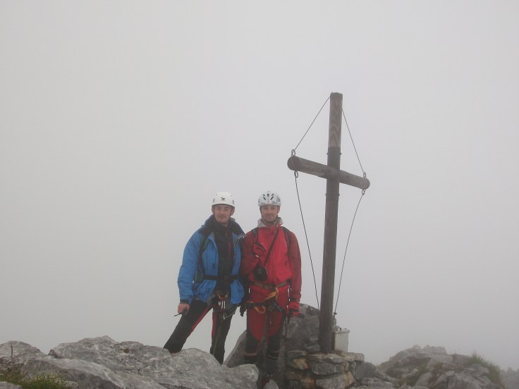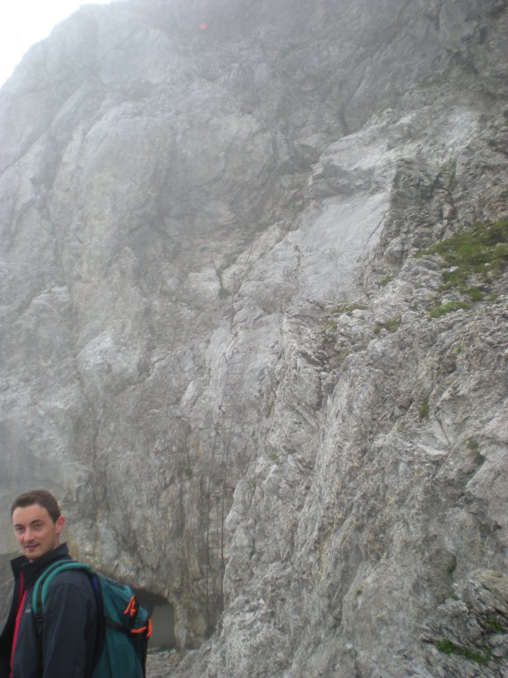 Dopo una breve discesa siamo all’attacco della ferrata, targa di bronzo e scaletta metallica come antipasto. Nei pressi c’è una galleria di guerra. Ci imbraghiamo, Ale sfoggia il metariale tecnico appena acquistato e cominciamo l’ascesa.