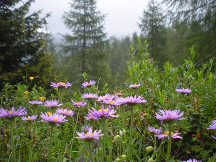 Il sentiero è comodo e attraversa radure fiorite contornate dai larici. Raggiungiamo in mezzoretta il pianoro sottostante la cima e contorniamo la torbiera che si è creata nelle varie ere geologiche.