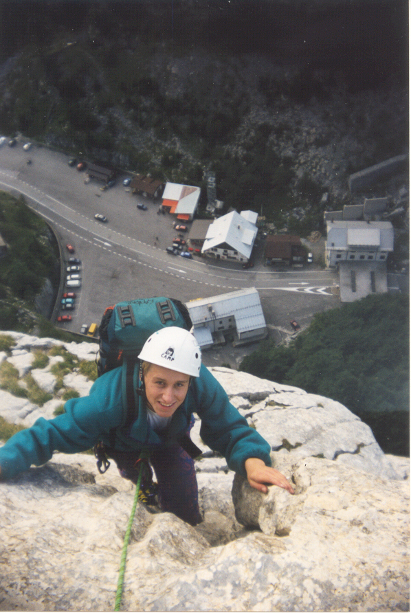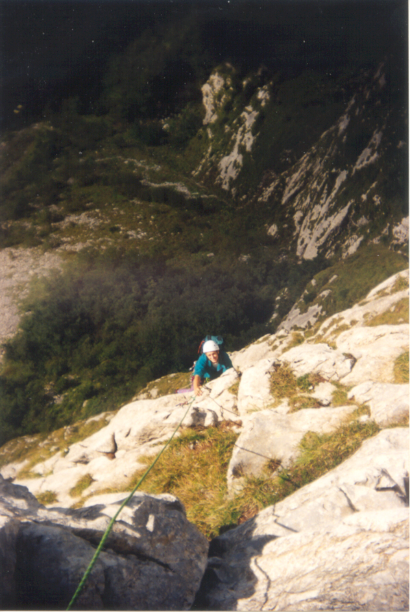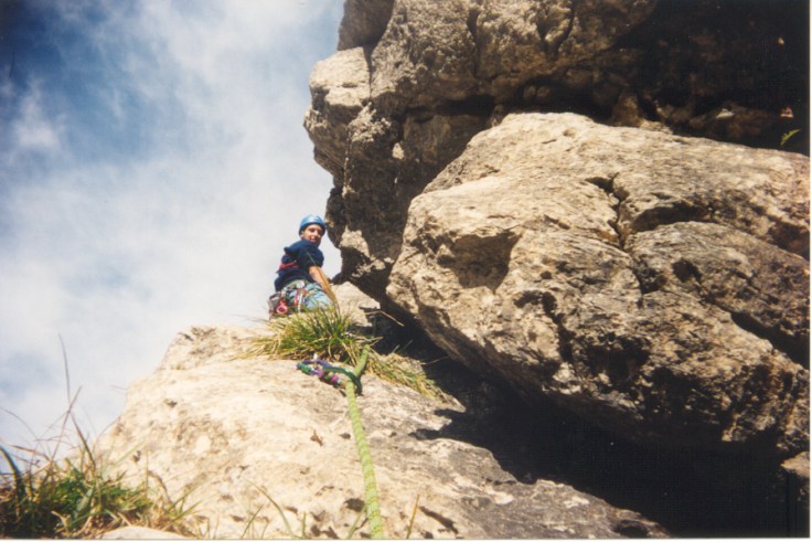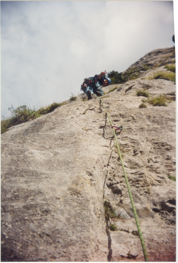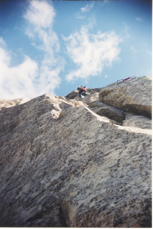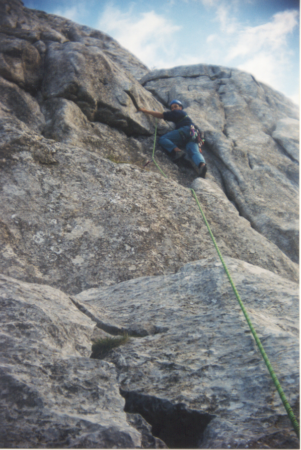 3°tiro: si mira alla fessurona di SX e ci si “imbuca al suo interno (con lo zaino è un pò problematico 🙂 ). Conviene tenersi sul bordo esterno. I piedi trovano un appoggio oramai un pò lucidato dai passaggi ma che lascia uscire indenni dalla fessura. Si prosegue quindi rientrando a dx per belle rocce lavorate alla sosta superiore. Problemi di comunicazione con il compagno di cordata alla sosta precedente. 4b-25m