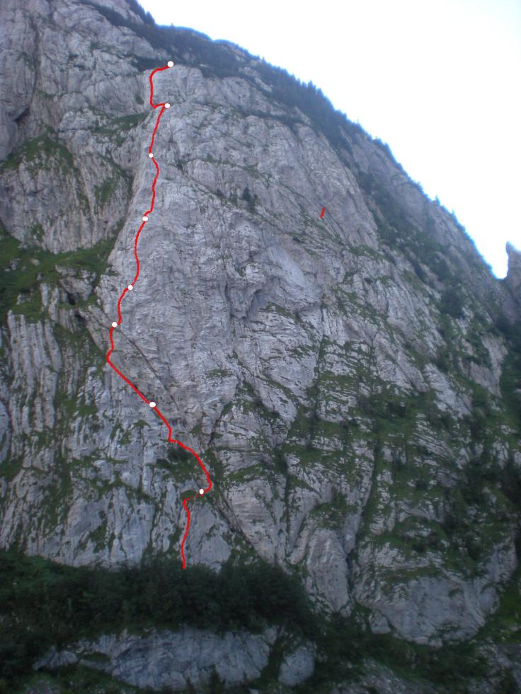 Note: da qualche anno sono state attrezzate altre lunghezze verso la parte terminale dell’originale tracciato. In particolare alla sosta del 7° tiro, prima dell’ultima lunghezza, è possibile scegliere 2 tiri alternativi al diedro sulla dx. Le difficoltà sono simili e si aggirano intorno al 4c, più o meno..