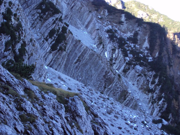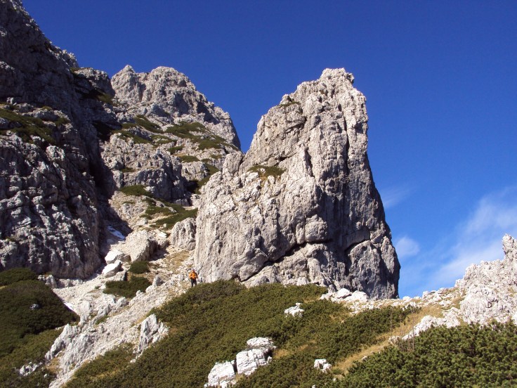 Altri 20 min e siamo ad un bivio: da una parte a breve distanza è raggiungibile la Casera dal Mestri, dall’altra si prosegue verso la cima. Guardiamo l’orologio, sono le 10 e arriva la notiziaccia che un membro della combriccola dev’essere all’auto alle 13.30.. L’andazzo prende una brutta piega e nemmeno il sole che finalmente fa capolino su di noi riesce a rallegrarmi per quest’ulteriore tentativo che già capisco è classificabile come “fallito” – niente Sernio nemmeno stavolta. Mi chiudo in me e salgo pensieroso il ghiaione sottostante la torre Nuviernulis che domina dall’alto la zona. Spettacolare.