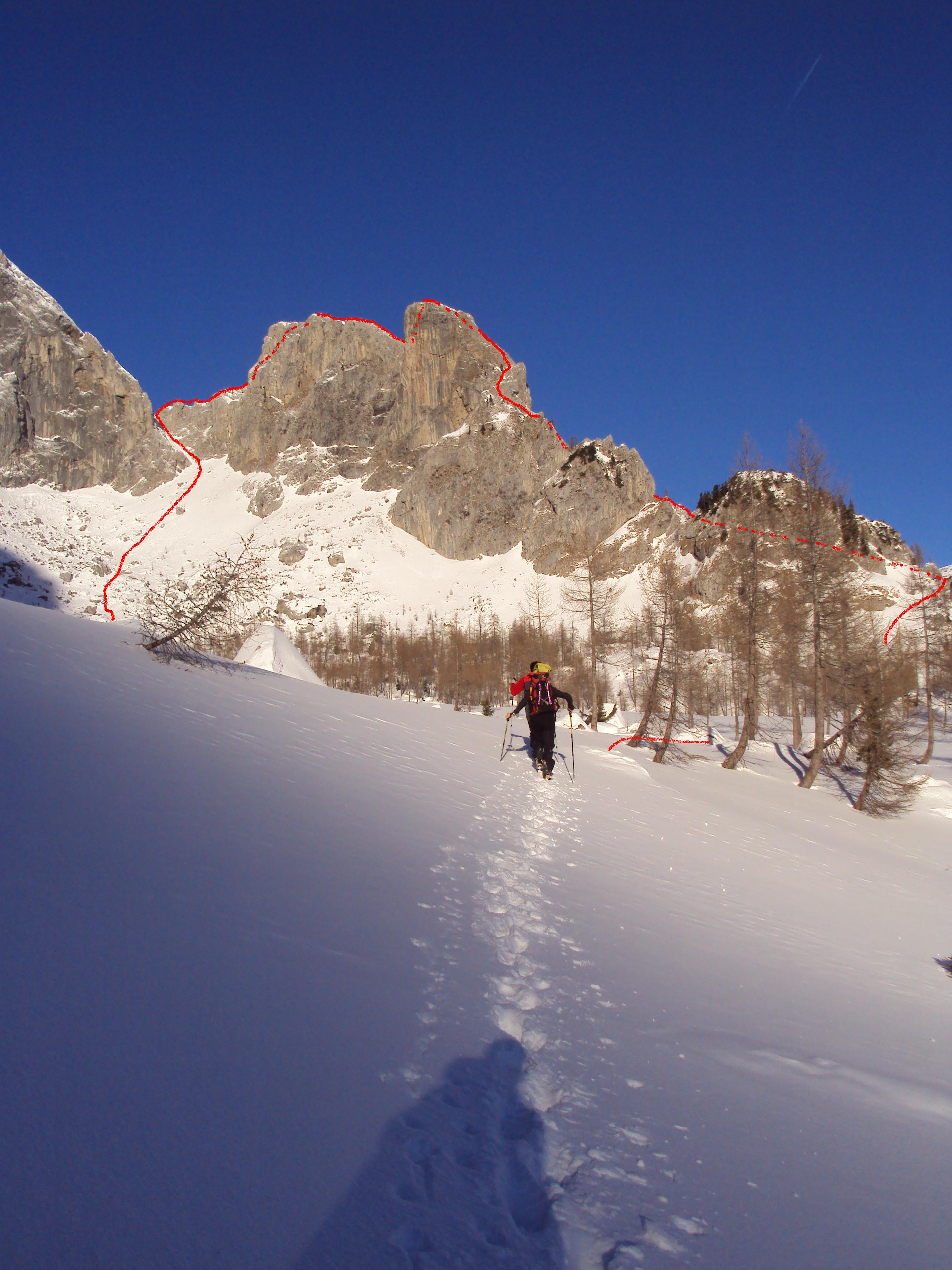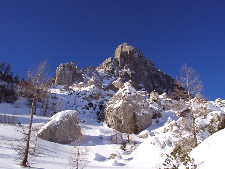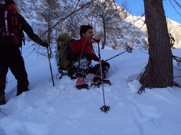 La situazione diventa tragicomica man mano che continuiamo in quanto lo spessore del manto continua a salire in maniera esasperante e le “ispezioni sul fondo”  si susseguono sempre più di frequente. Mirando alla displuviale del Madrizze siamo costretti ad inoltrarci nel labirinto di sassoni e mughi che sta alla base delle torri, già so che sarà la nostra fine.. Fra larici scheletrici e sensi di colpa che vanno ingigantendosi per aver convinto i miei amici a salire da questa, e non per le piste di Pramollo, silenziosi sopra di me volteggiano gli improperi di Fabio e Andrea: il primo ha un dialogo aperto e veemente con la Vergine Maria, mentre il secondo implora il nome del Signore affiancandolo a coloriti aggettivi. Io sono al limite della bestemmia ma non lo faccio, è solo colpa mia e delle mie scelte e dopo la centesima volta che sprofondo fino all’ombelico mi scappa anche un sorriso pensando che se fossimo in una camera da letto questo sarebbe definibile come “masochismo”. La danza delle tartarughe spiaggiate (il moto di dover uscire dalla neve è quello: affondamento, scavo della neve a 360°, schiena e zaino verso l’esterno, uscita cauta dalla buca) comincia a finire solo verso la displuviale del M. Madrizze dove il vento che ha soffiato ha cacciato la neve polverosa lasciando scoperto sassi ed erba ghiacciata.