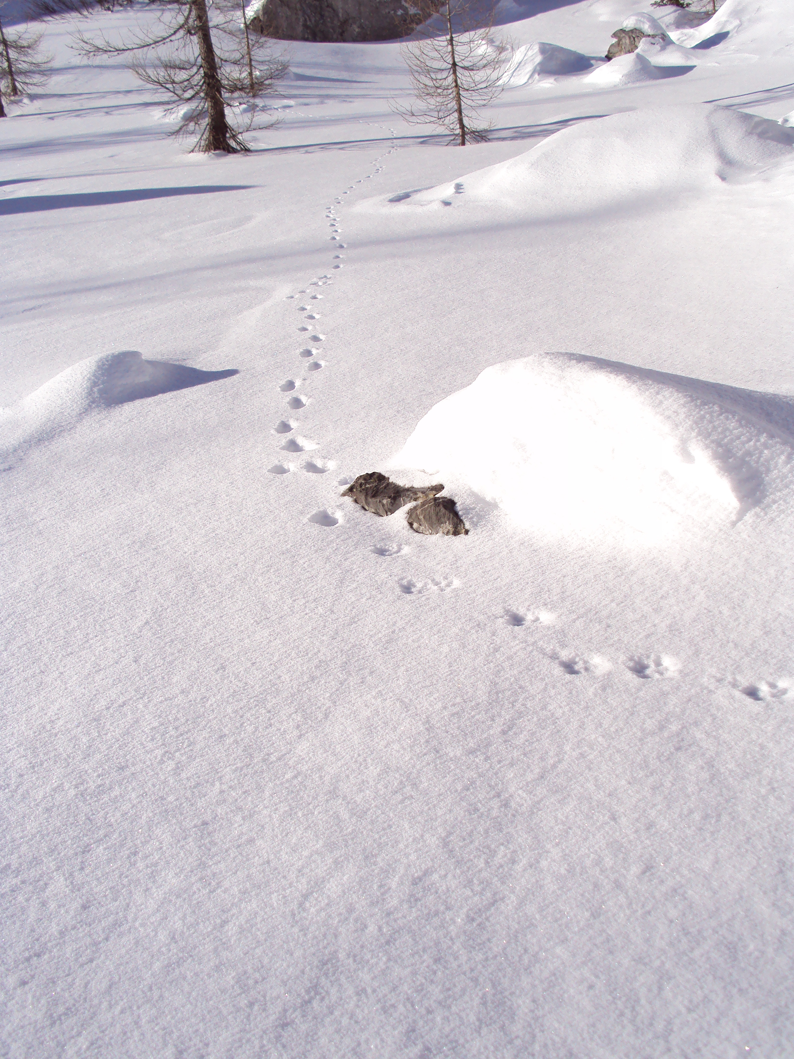 L’inconveniente ci farà partire un’ora dopo l’orario prefissato. Prepariamo i materiali, oggi negli zaini non manca niente, siamo stufi di dover tornare puntualmente sui nostri passi perchè abbiam lasciato a casa qualcosa di necessario percui stiviamo negli zaini 2 picche, corda da 60m, chiodi da ghiaccio e da roccia, nut, cordini, moschettoni in quantità tale da poter affrontare la parete N dell’Eiger, altro che traversata invernale del Winkel!. Il peso dei materiali si farà sentire più tardi, poco dopo l’attraversamento della radura della baita Winkel, quando la neve comincerà ad aumentare di spessore in maniera piuttosto preoccupante.. Non mi capacito da dove arrivi tutta sta neve fresca visto che quest’anno neve in giro ce n’è veramente pochissima… Più si sale e più si fatica. il Pelle, come il Signore, cade la prima volta prontamente aiutato dalla Maddalena Fabio che gli asciuga i sudori.