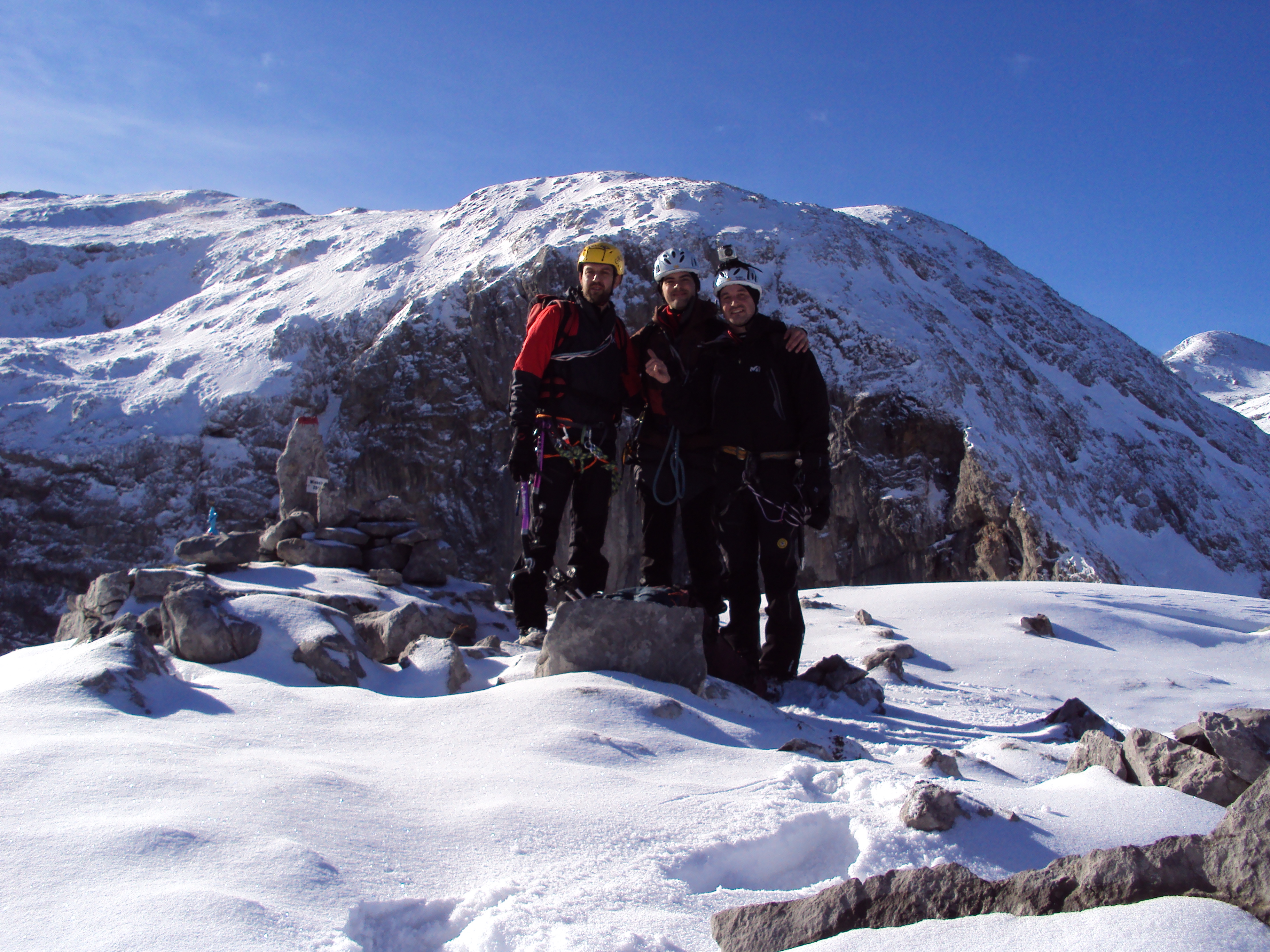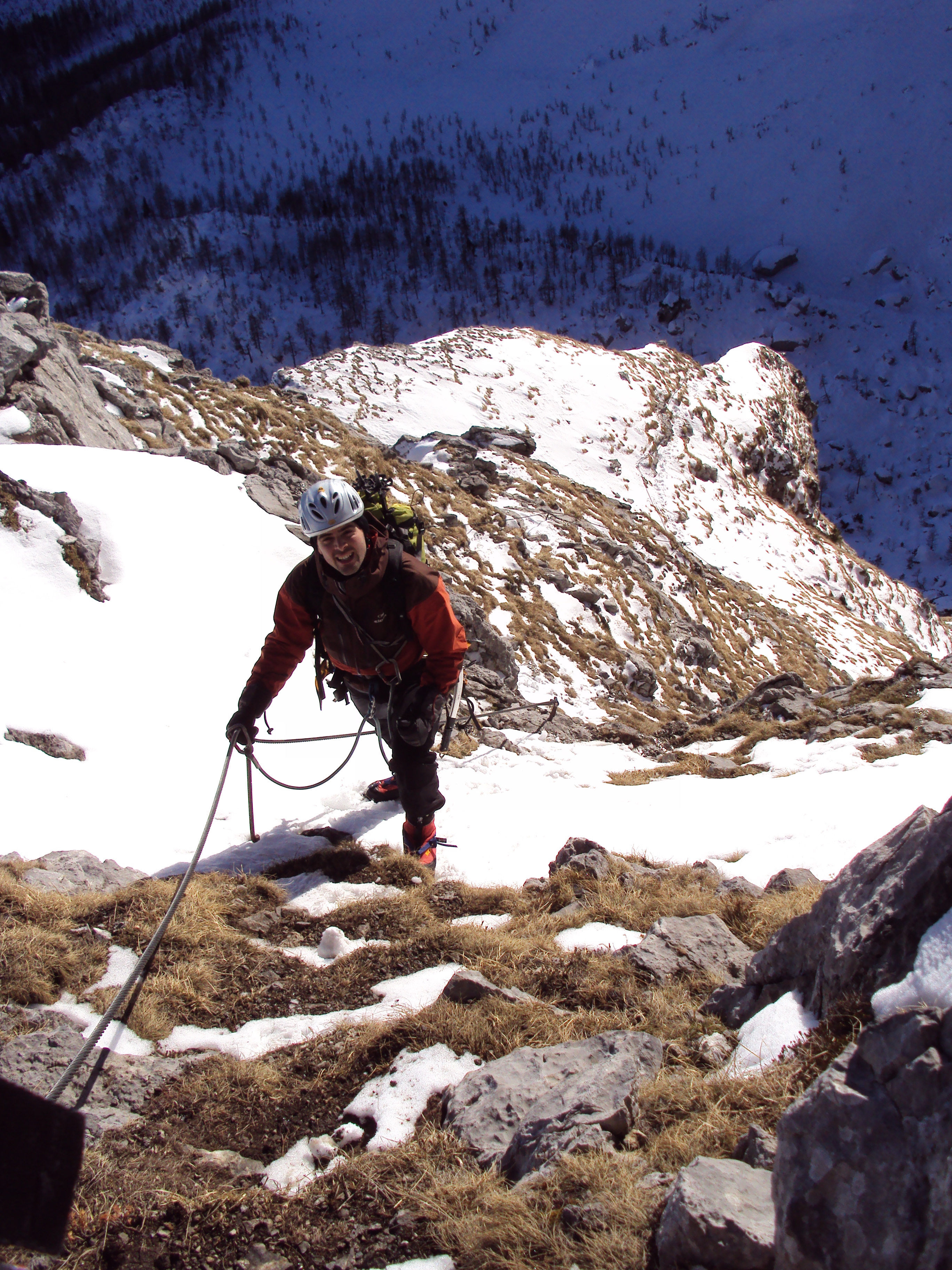 Abbiamo impiegato 2.30h invece dei miei conti che prevedevano 1.30h scarse. Sono scannato. Per non “appesantire” la situazione sociale con i miei 2 compagni di ventura ho portato la corda per tutta la salita, troppi sensi di colpa.