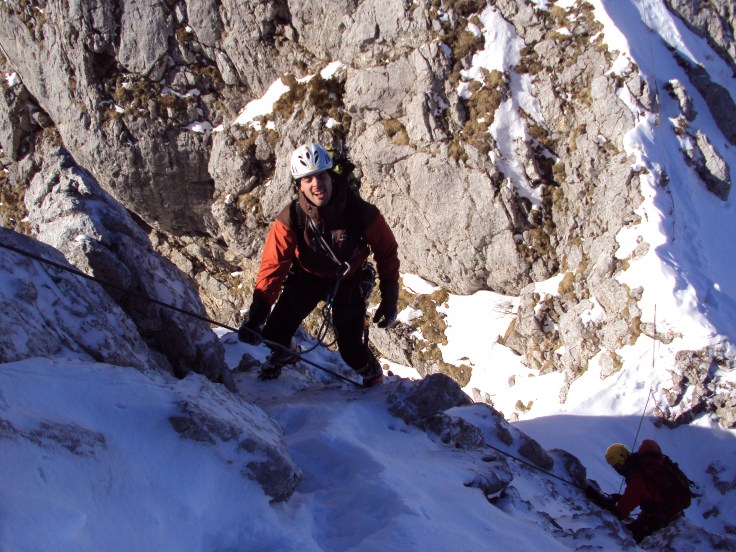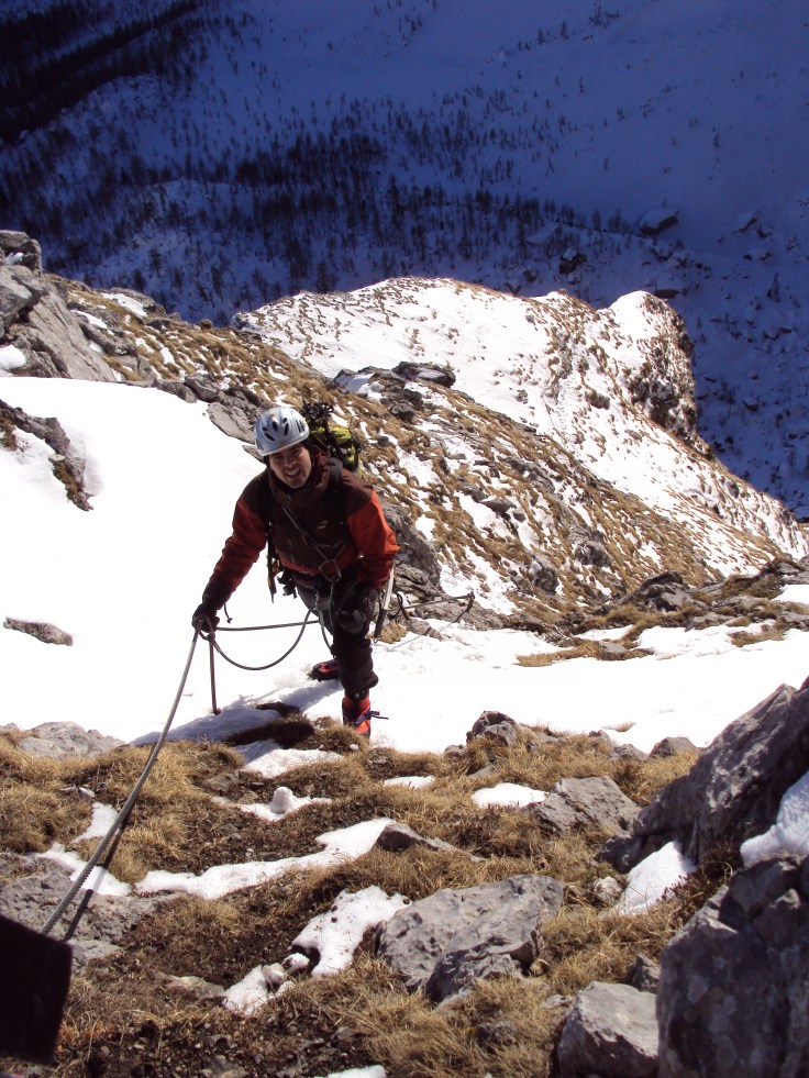 Attacchiamo la ferrata tracciata sulla cresta E della torre Winkel curiosi di vedere cosa ci aspetta. Il primo tratto sale ripidi verdi per aggirare la costola che dà sul vallone del Winkel, torniamo al sole. La salita è esposta ma non difficile, il cavo dà sicurezza essendo scoperto dalla neve. Seguono un tratto verticale su roccia agevolato da pioli metallici e un terrazzino a metà salita dove ci si può fermare a godere del bel panorama.