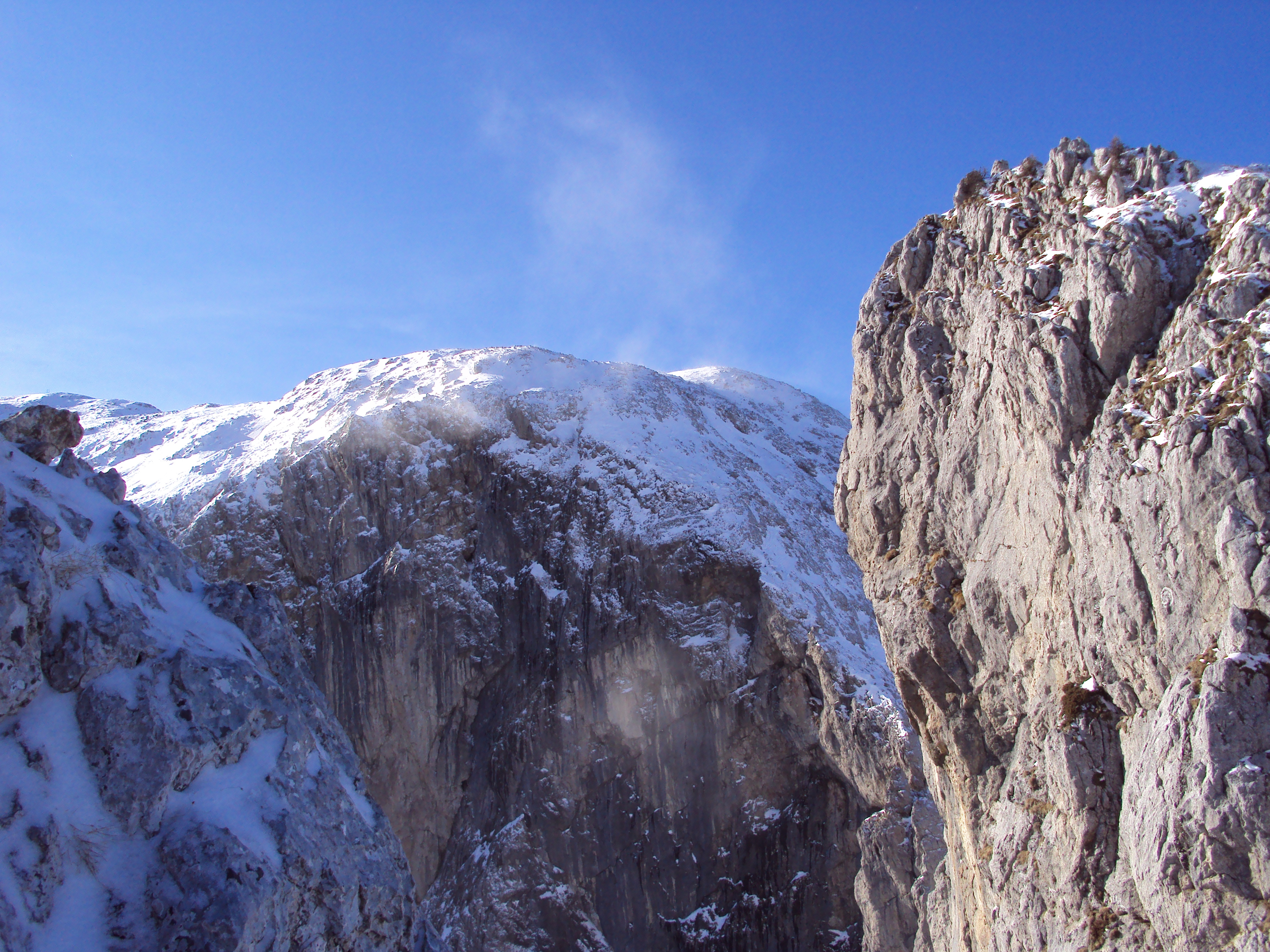 Il panorama è splendido, impressionante la vista del vicino versante N del Cavallo dove la neve turbina in mulinelli veloci che sfiorano le pareti e il baratro.. Effettivamente a pochi passi c’è il salto del versante S, un bel saltino…. L’anno scorso salivamo proprio la N, mi fa un pò effetto pensare a dove siam saliti senza assicurazione; 2 alpinisti sono impegnati poco sopra la forcella, vedo però che tornano subito sui loro passi.