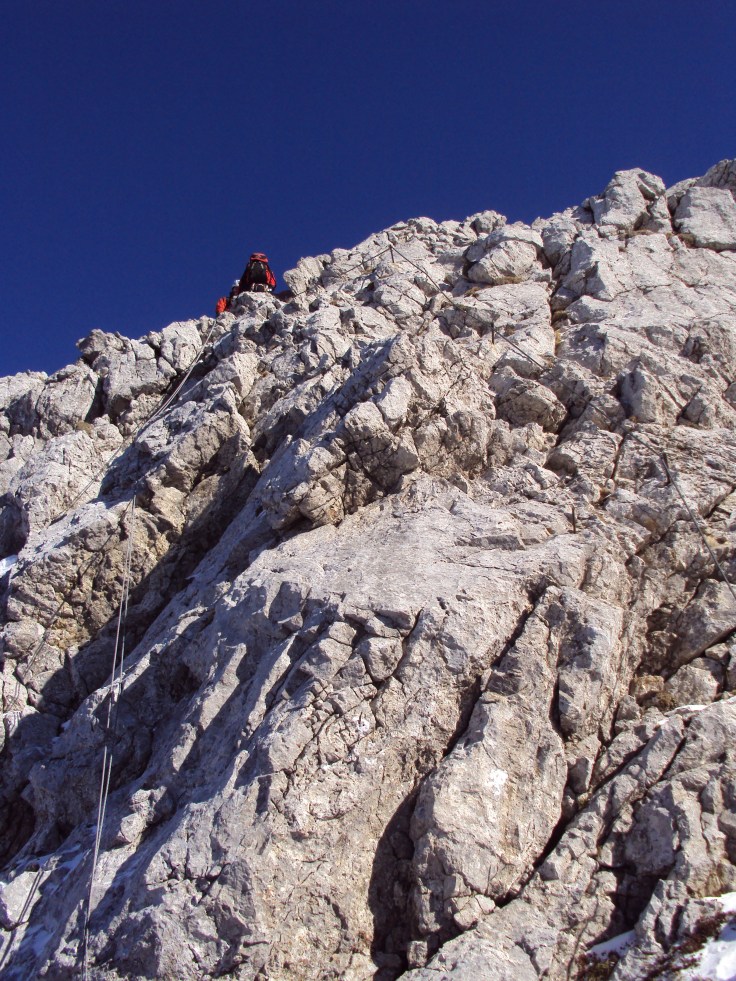 L’ultimo tratto ripido conduce dal versante S a quello N e si torna alla neve e al ghiaccio sul traverso che porta alla fine delle attrezzature. Ormai siamo verso la cima della Winkel che raggiungiamo in breve per rocce ghiacciate.