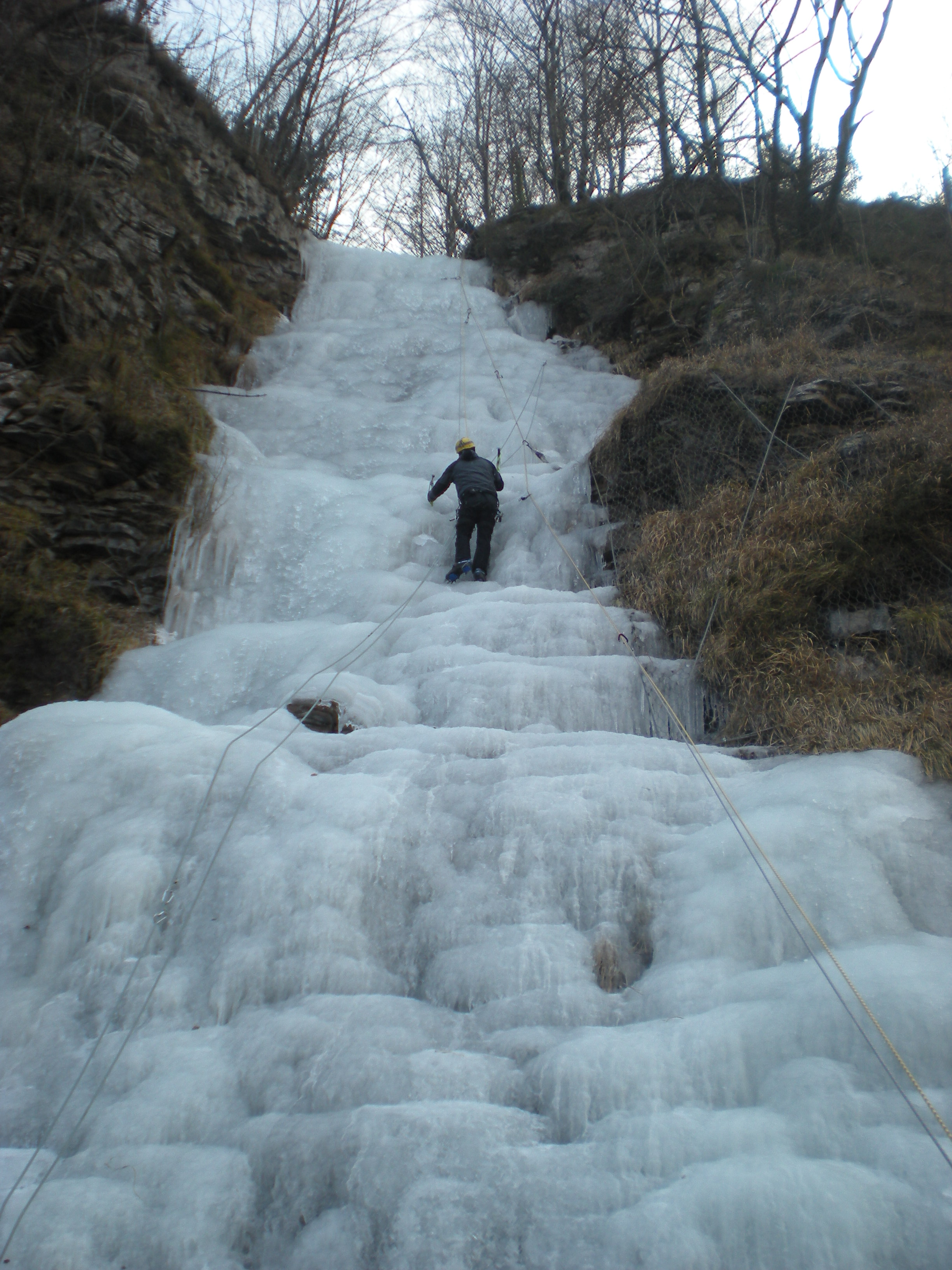 Ci dediachiamo quindi alla salita del primo tiro, più impegnativo con uscita di forza su muretto verticale dopo una roccambolesca calata in doppia sulla corda ghiacciata di Piut.. Roccambolesca perchè la sua corda, di diametro nominale 11 ma in realtà 12, ghiacciata è diventata da 13mm e scendere si è rilevato quasi impossibile. In qualche maniera comunque ce l’abbiamo fatta e ci siamo goduti il primo tiro della cascata del Checo.