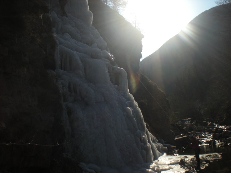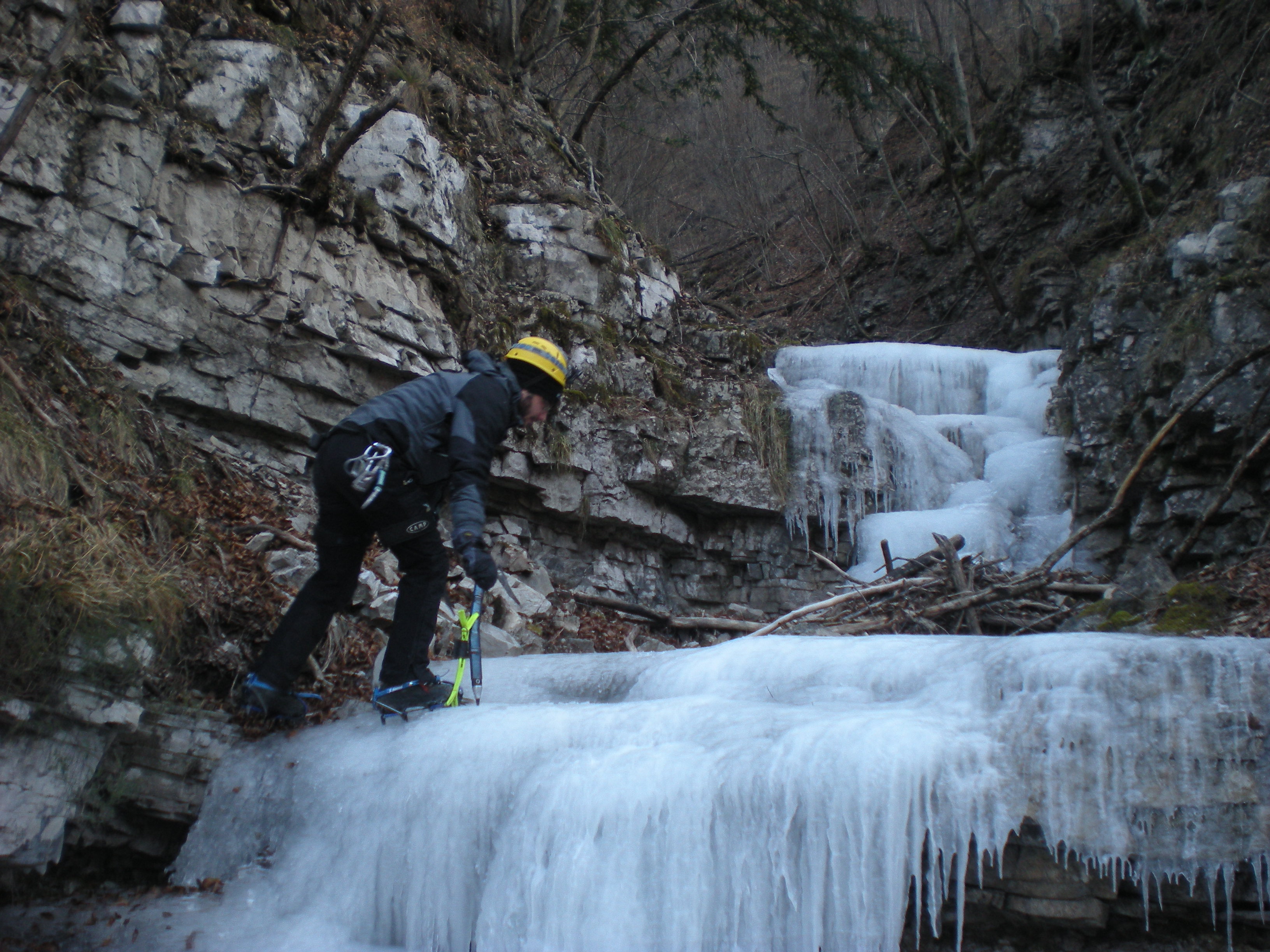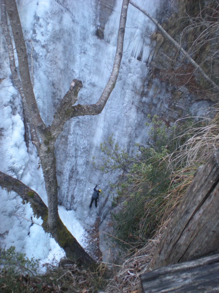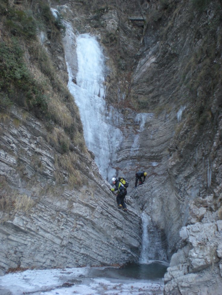 La cascata è alta circa 25m e potrebbe essere salita in più punti se fosse più ghiacciata; oggi solo la parte frontale è fattibile. Lascio alla base Piut e Psycho e cerco di andare a mettere una doppia dall’alto per la sicurezza degli astanti ma non c’è verso di raggiungere il punto desiderato: da poco dev’essere franato il sentiero di accesso alla forra superiore e il rischio di finire in testa a quei 2 è piuttosto alto (dopo un volo di oltre 30m)… Rinunciamo quindi alla salita di questa bella formazione lasciando spazio a chi, non come noi, si fida a calarsi su di una sosta realizzata con ancoraggio “Abalakof”…