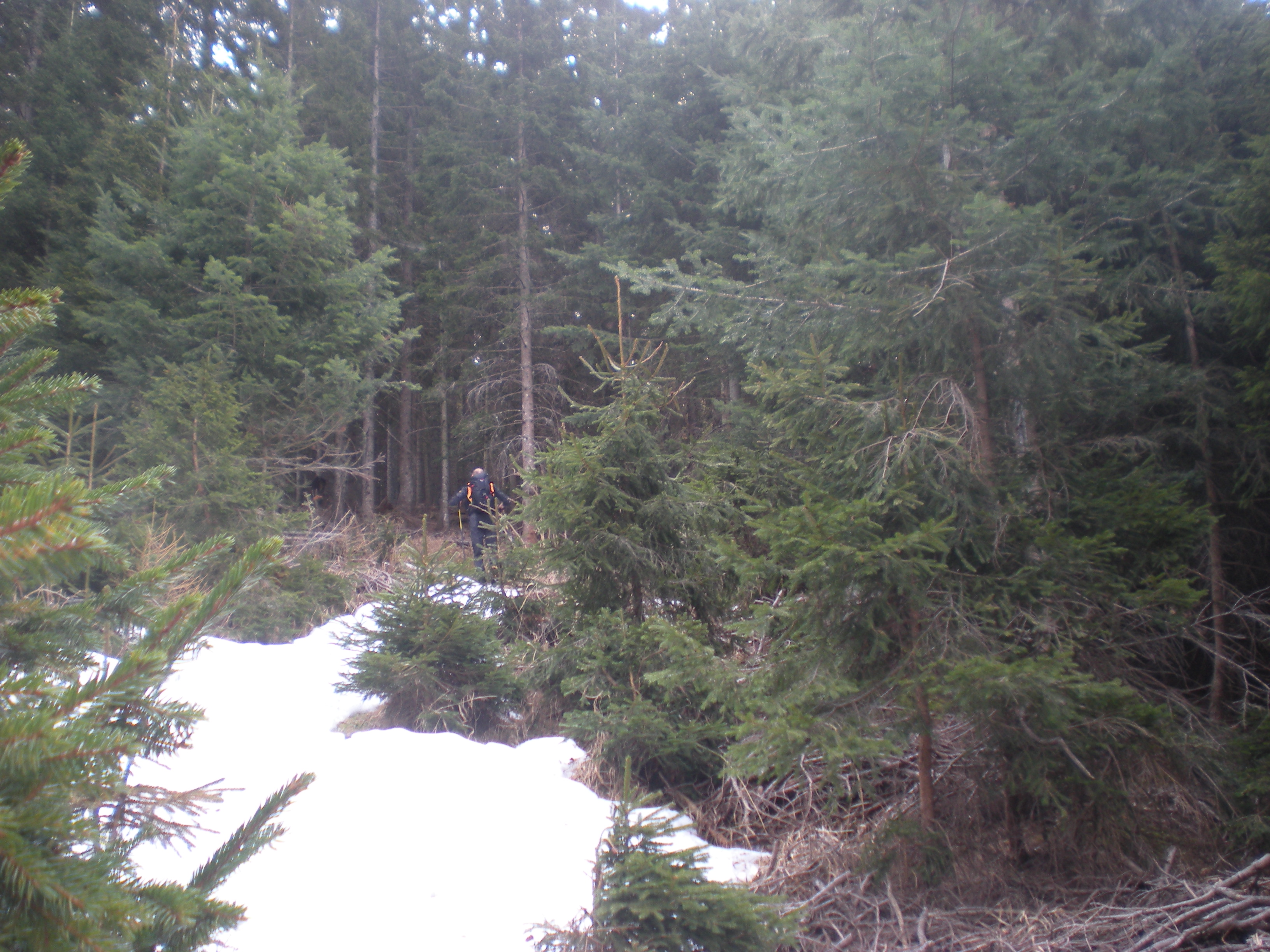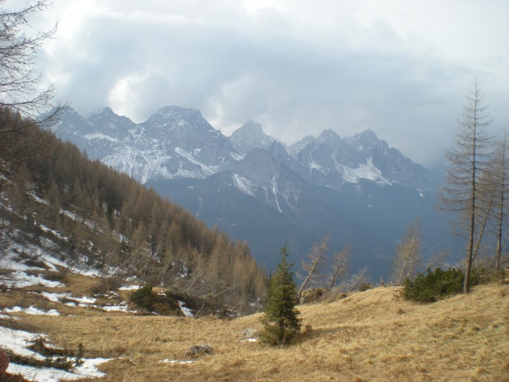 I prati si rivelano più insidiosi del previsto: sotto all’erba secca il terreno ghiacciato rende particolarmente scivoloso ogni passo, stiamo attenti e man mano che si perde quota si allontana il pericolo di una brutta caduta e quello di beccarci una grandinata di inizio stagione.