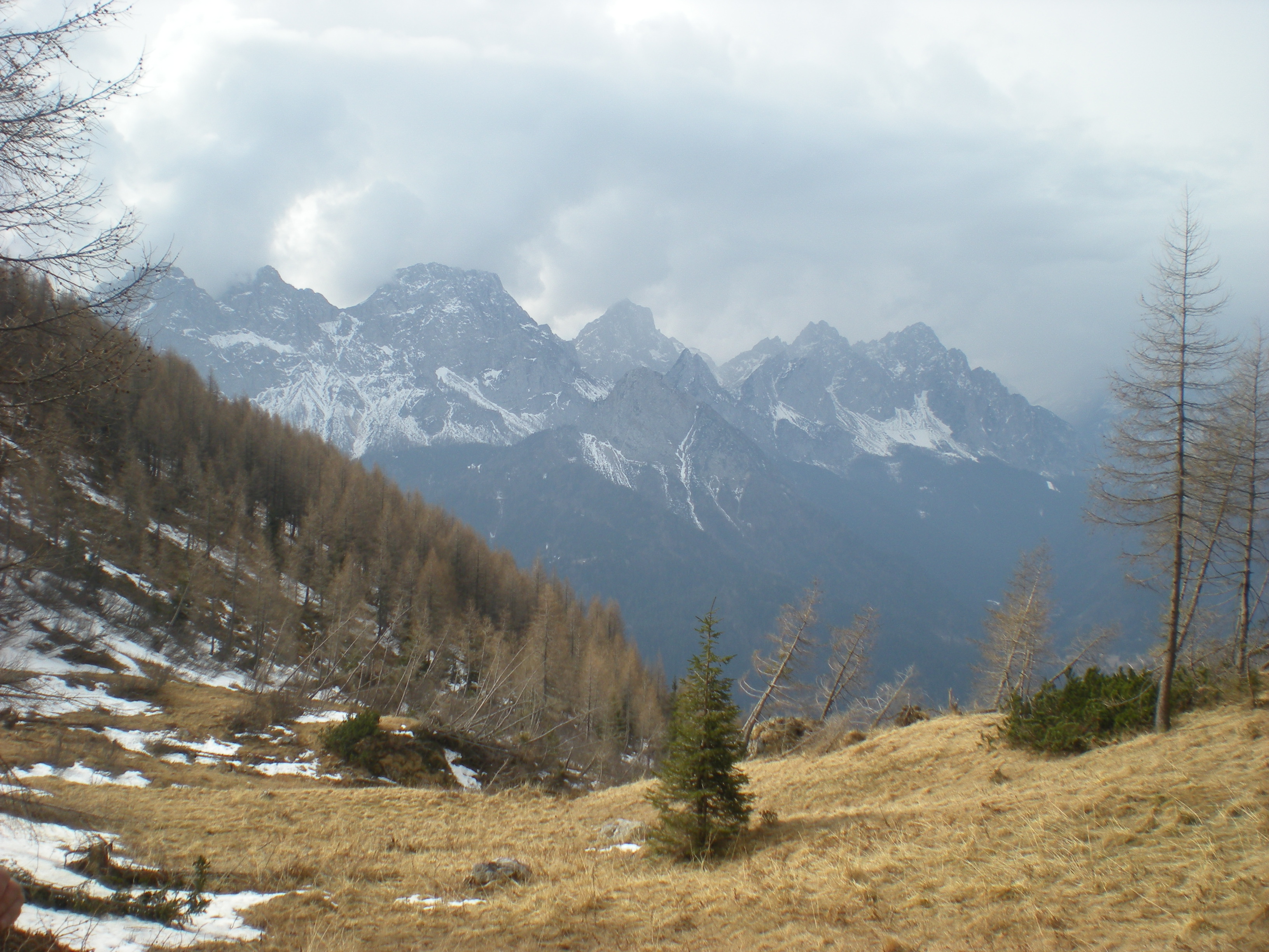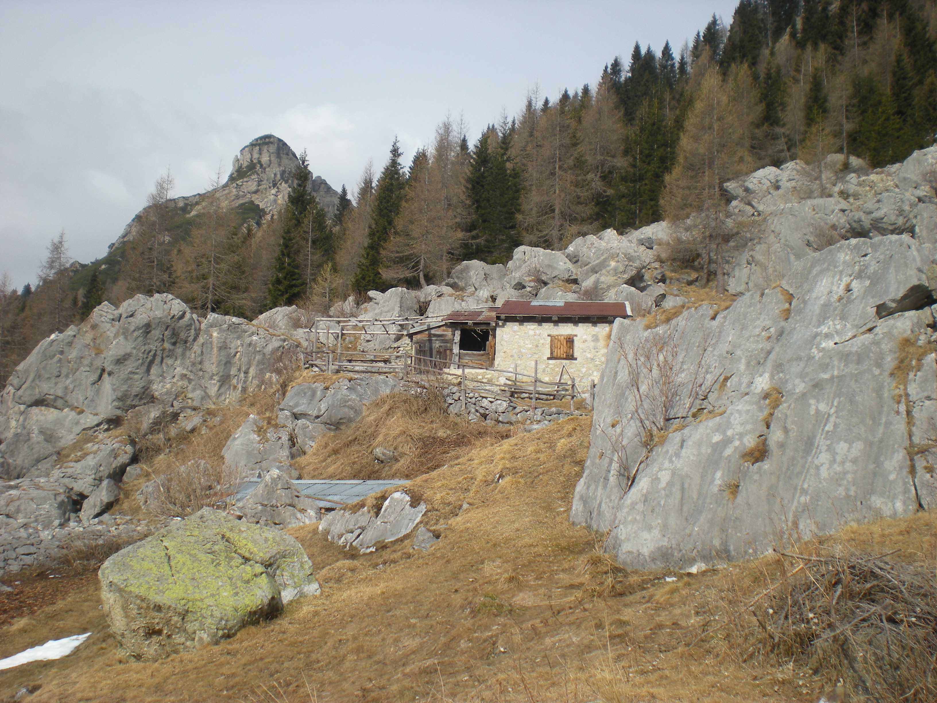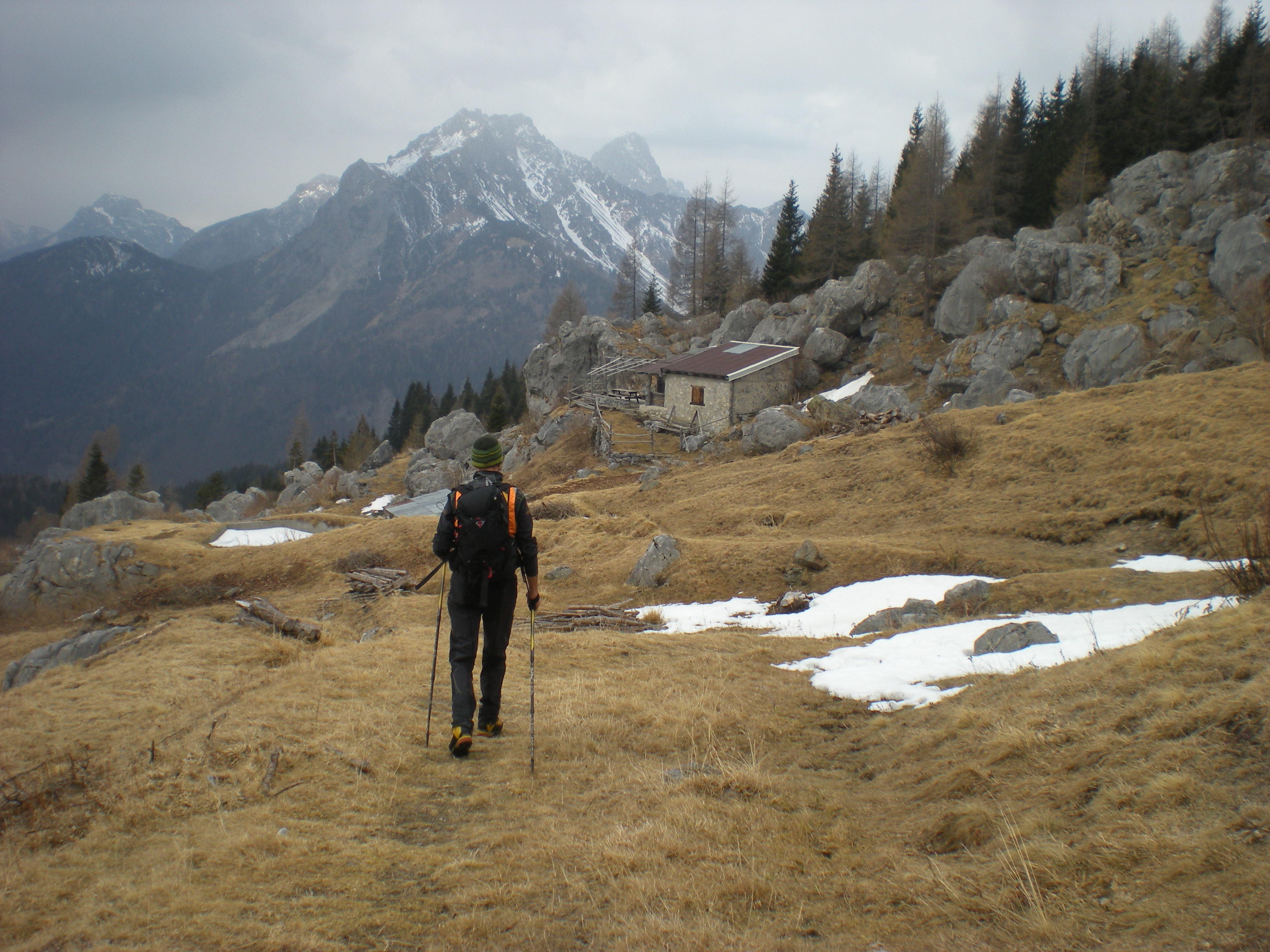 Caldo, 10° e siamo a inizio marzo. Il bosco si sta risvegliando, parecchi volatili cinguettanti sopra le nostre teste ci accompagnano lungo la salita che effettuiamo sul sentiero CAI 169 diretti alla Casera Monte dei Buoi. Il sentiero si inerpica in un bel bosco rado di abete rosso per poi raccordarsi alla strada di servizio della casera rimessa a nuovo da poco. In circa 40 min siamo nei pressi della rustica costruzione dove incontriamo 2 coppie di escursionisti muniti di ciaspole… Il bello è che fino a qua la neve è perfettamente latitante! Acceleriamo il passo mirando alla parete O che ben si delinea anche dal fondovalle, almeno per un occhio attento.. Il sentiero è visibilmente figlio di una vecchia mulattiera di guerra. Le macchie di neve ora sono più frequenti ma sempre in minoranza sui pascoli alpini di questa zona.