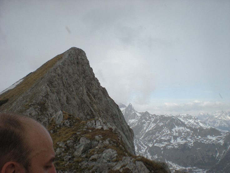 Il polistirolo comincia ad assumere dimensioni crescenti e temo si tramuti in grandine ma voglio raggiungere la cima percui forziamo ulteriormente il passo. Una prima delusione mi viene dall’arrivo in quella che credevo la cresta e che si rivela solo un cambio di pendenza. Altro tratto, stavolta su neve, e siamo sull’orlo del versante N della montagna, un bel salto che degrada verso la vicina zona di casera Ombladeet. Ora le nuvole si son fatte pesanti, meglio non “cincischiare”..