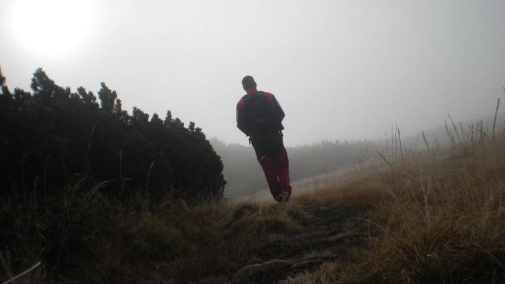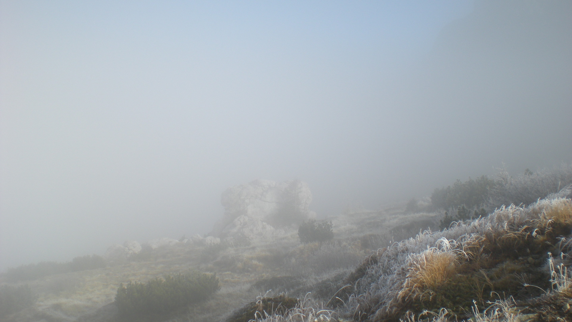 Calzati gli scarponi intuisco subito che il caldo di fine stagione oggi dev’essere altrove.. Non voglio fermarmi ad indossare caldi indumenti e preferisco il riscaldamento termoautonomo: accelero il passo. Dopo circa 15 min di cammino, mi addentro in una incomprensibile, quanto strana, atmosfera.. Il vento soffia da oltre confine con raffiche veramente gelide; tutt’attorno i banchi di nebbia corrono veloci in direzione dei prati sottostanti portando via il sole, che poco prima mi baciava, e i miei pensieri confusi che ancora ho nella testa.