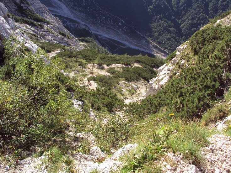 Sconcertante vedere bimbi di 4 anni che scendono nelle più disparate/disperate maniere, con genitori che pensano di assicurarli a dovere… Una mamma tiene la propria bimba legata con una specie di cintura, non imbrago, alla corda che ripassa 3/4 volte nella sua mano.. Immagino che una caduta della piccola porterebbe giù entrambe. Non so, io non mi vedo a portare il mio piccolino a 4/5 anni su per qua. Ma gli Sloveni son diversi, gente di montagna ma anche gente con poco giudizio: un trentenne con vesti borghesi ci sorpassa in discesa in uno dei punti più brutti, sembra che abbia le tarme nel culo, si e no si tiene al cordino, ovviamente non assicurato.