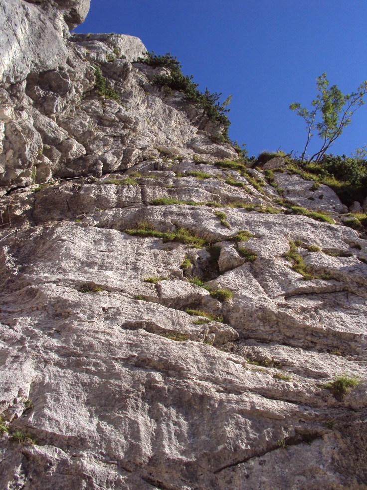 Lasciamo l’erboso zoccolo per infilarci in un canalino, cominciano le attrezzature che alla fine in questo tratto sono anche superflue, tanta la gente che scende. il canalino è cosparso di vecchi fittoni resi lucenti dai passaggi, oltre questo tratto la quota va salendo e si segue lungamente verso sx la cengia di mughi che taglia tutta la base di questa porzione di parete. Ci sfilano parecchi “personaggi”, tutti con uno strano ghigno che compare al nostro avvistamento, chissà che pensano. Il sentiero sale ripido, non molla un attimo e i tratti attrezzati si susseguono veloci, magari solo per contornare qualche saltino su cenge più esposte. Tornanti di fina ghiaia, vecchi gradini di legno o addirittura scalini intagliati nella roccia.