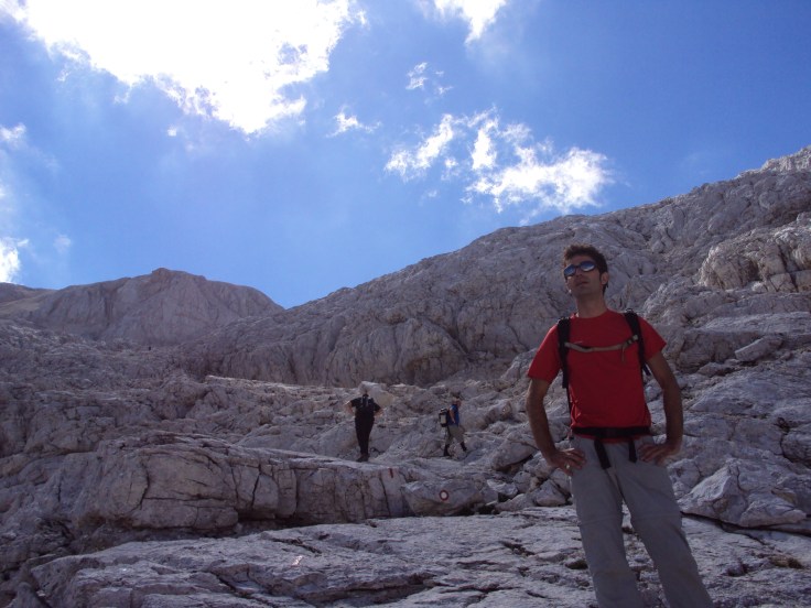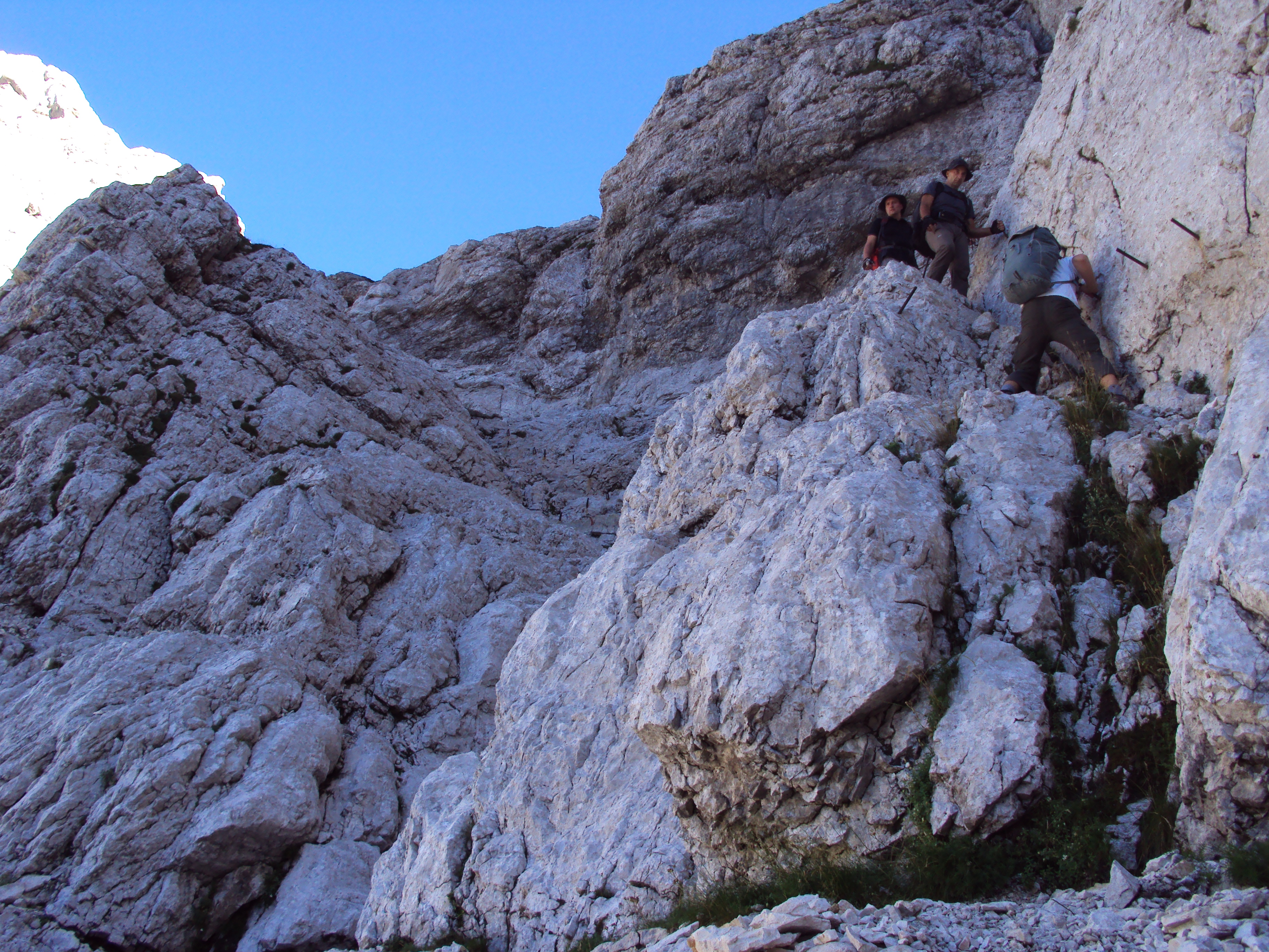 Saliamo fino a girare uno speroncino e trovare il tratto attrezzato che aspettavo, saranno 20m di ferrata, ben protetta, da qua ci imbraghiamo non sapendo cosa ci attenderà poi; aspettiamo ovviamente che lo sloveno del caso con l’I-pad filmi la discesa delle attrezzature dei suoi amici… In montagna con l’I-Pad, non ho parole. Oltre il facile tratto attrezzato si continua a salire ripidi, il sole batte, il sentiero non molla un attimo. Altro tratto a fittoni, e si traversa ora verso la base delle pareti dall’altra parte del canalone. Una tipa impedita scende a ritmo di lumaca, immagino non arriverà all’auto prima del buio. Noi continuiamo spediti anche se le distanze mi fregano: tutto sembra più vicino di quello che in verità è!