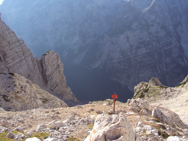 Dopo un’altra serie di fittoni arriviamo in corrispondenza della parte finale che conduce al circolo sommitale. Comincio a sentire la fatica della digestione e tutta la sudata fatta. Continuiamo fino al bivio di quota 2200, dobbiamo scegliere se tentare la fortuna al rif. Valentina o al Triglavski Dom.. Direi che il primo, più basso, è quello che fa per noi, il cartello indica 35 minuti, per me sarà agonia a un passo dai crampi – che disastro!