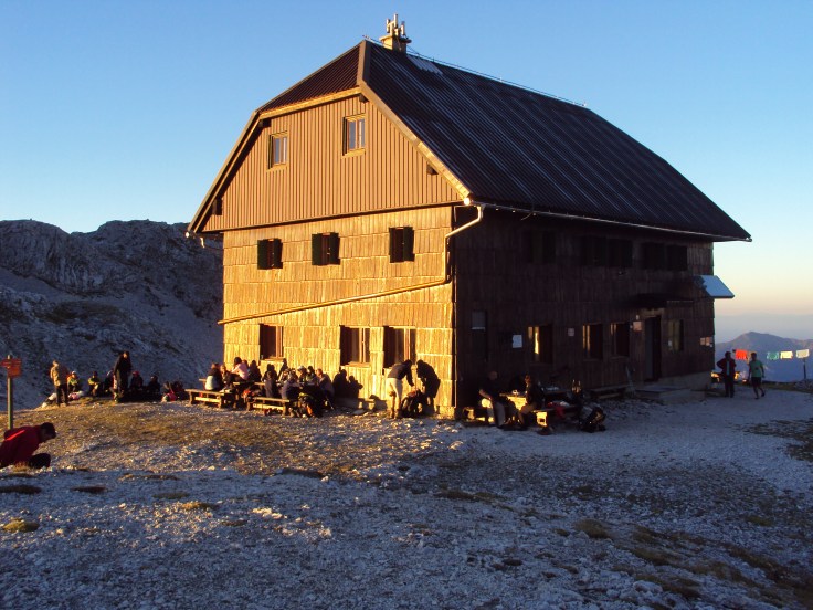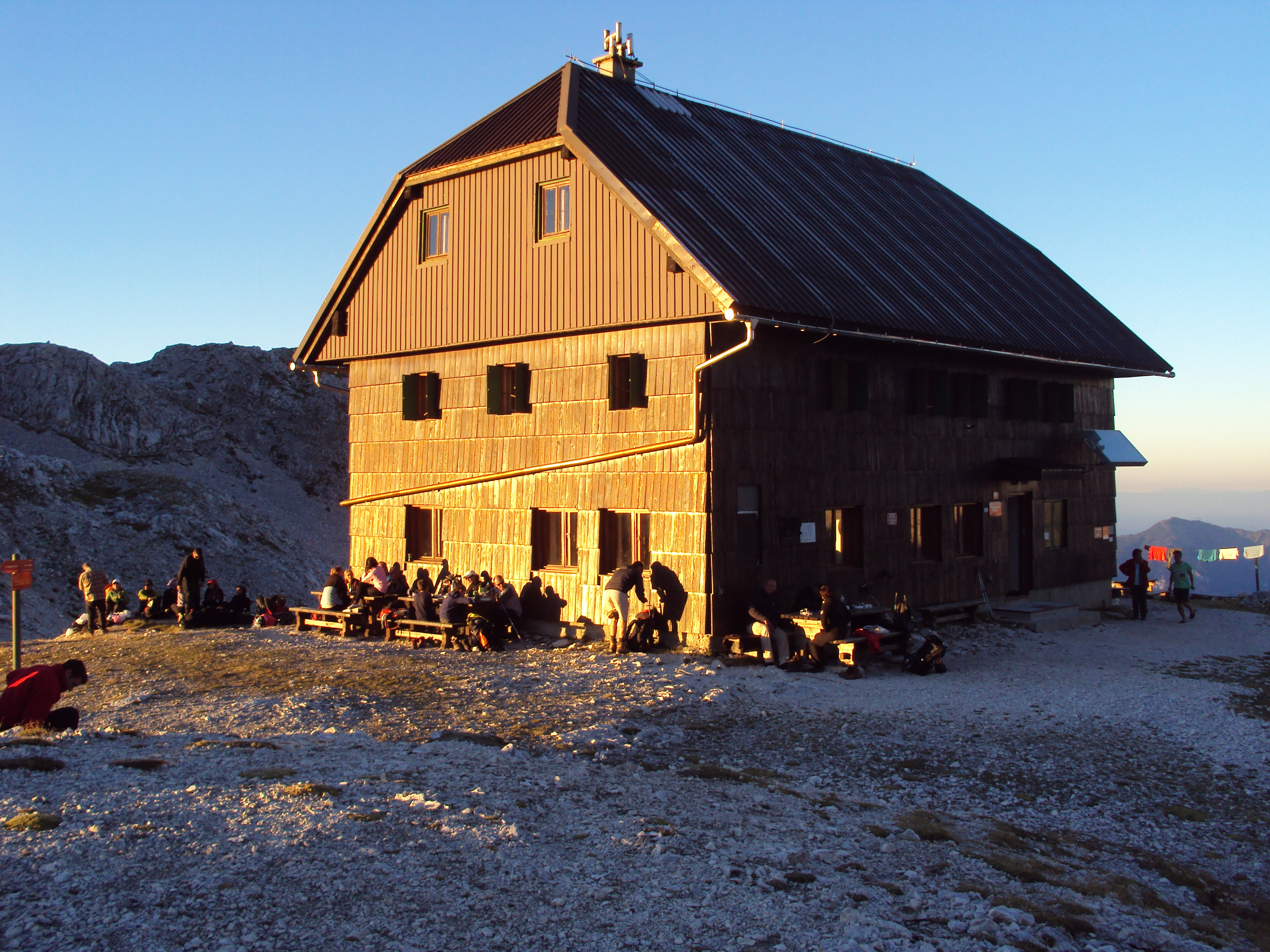 Il rifugio è molto affollato, tentiamo la carta del sorriso con la gestrice dalla pelle raggrinzita.. Ad un attimo di iniziale sconcerto, ci pensa e offre alloggio in un vano deposito, il meglio che ha! Noi siam contenti, non dormiremo all’aperto, ci basta questo per renderci sereni. Il praticello di fuori accoglie le nostre chiappe stanche, ci godiamo il tramonto estasiati dallo sky line dello Jalovec in lontananza