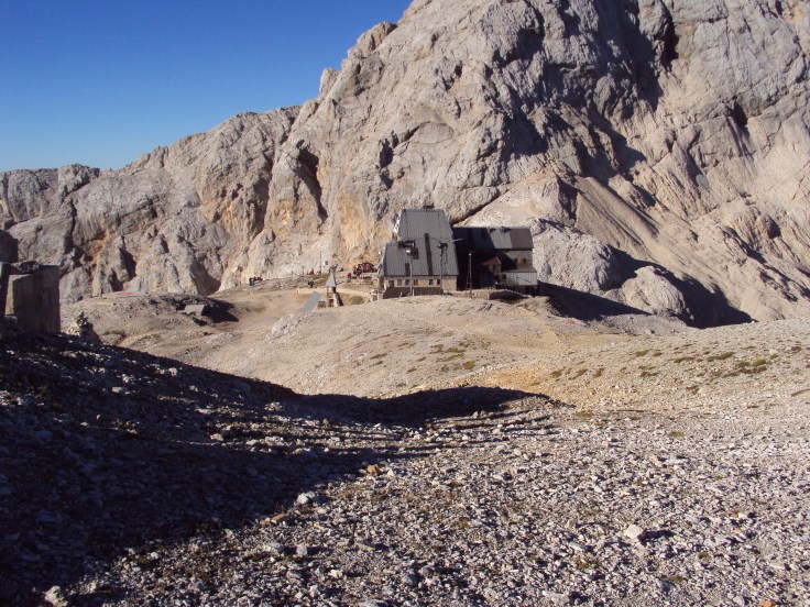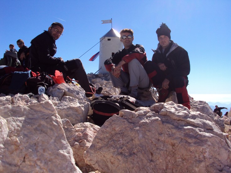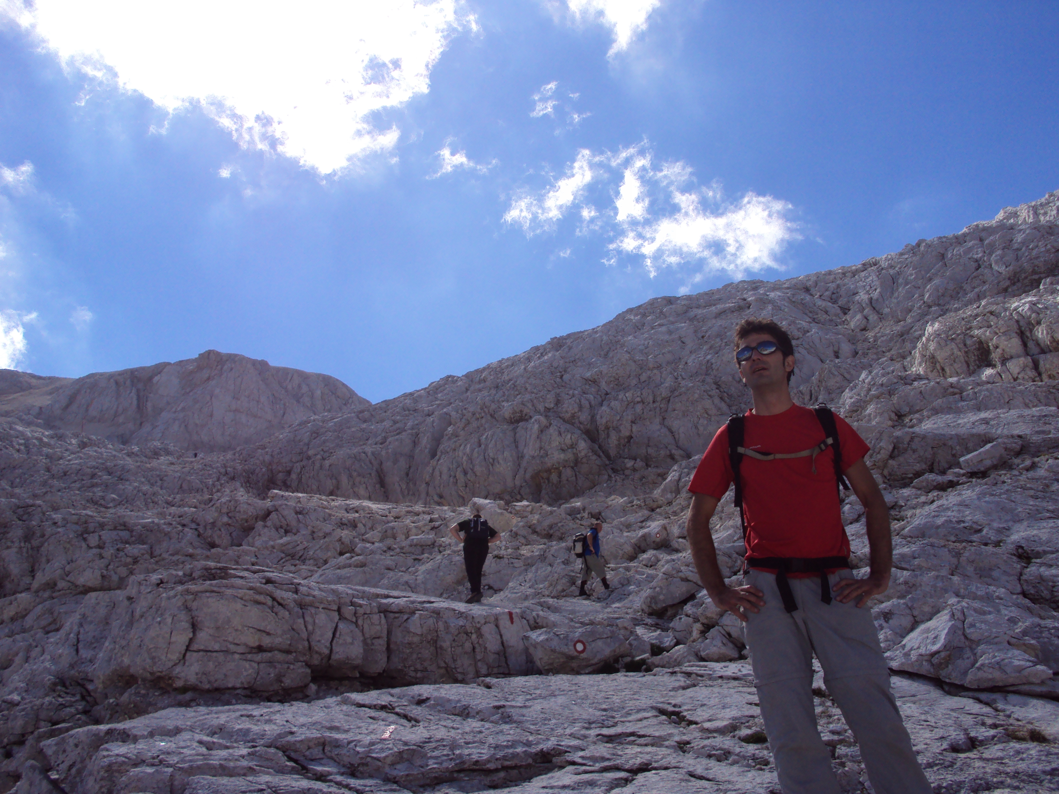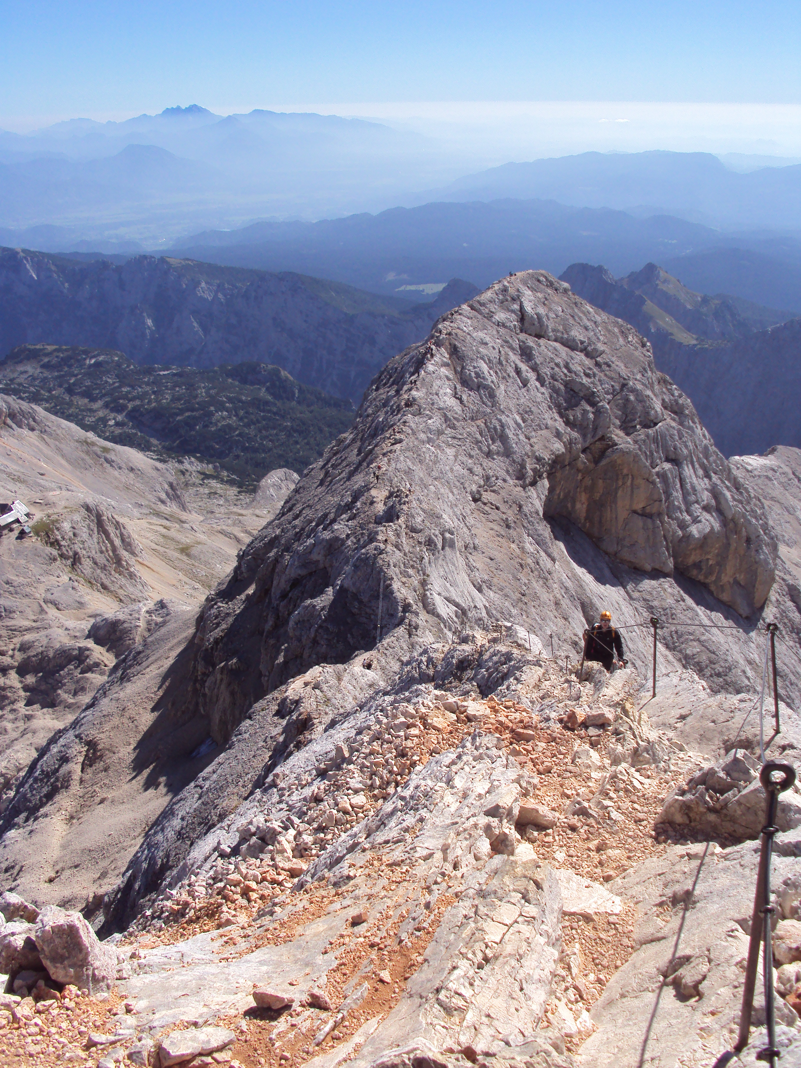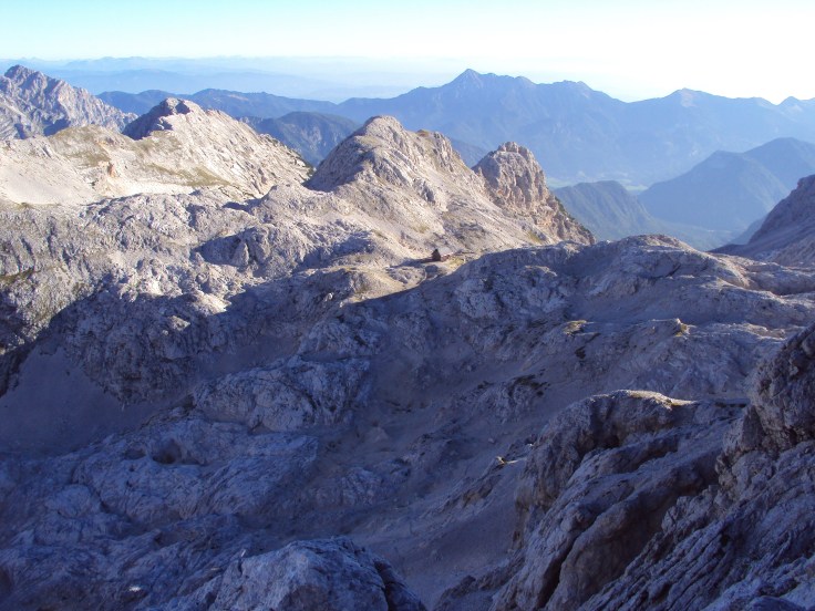 Dopo numetrose fermate per far passare la gente, raggiungiamo il cartello che indica 30m alla cima (ma che cavolo l’han messo a fare?) e subito dopo ci stringiamo la mano vicino al “bivacco a forma di siluro” detto anche Aljazev Stolp, strana costruzione posta sulla cima della Slovenia. Obbiettivamente sembra di avere sott’occhio la cartina di mezza Europa, la vista spazia su un notevole raggio d’azione dalle Dolomiti ai Tauri alle Caravanche, al mare e alla pianura padana, veramente tanta roba. La bella giornata ci fa stare una buona mezz’ora in cima. Le iniziali voglie di compiere in anello la discesa verso la forcella Luknia utilizzando un’altra ferrata sono messe a tacere da un autoctono che in inglese riferisce grosse difficoltà in discesa.. Rientriamo quindi sulla via percorsa e poi deviamo subito a sx, attraversando il paesaggio lunare carsico del “ghiacciaio verde”, che in pratica non esiste più. Enormi bancate di calcare rotto solo dalla forza dei ghiacci dove ogni goccia d’acqua si perde nel cuore della terra gettandosi negli inghiottotoi che sono ovunque. Tutto molto bianco, sembra un deserto di sale. Il sole batte, sudo come e più del giorno prima.