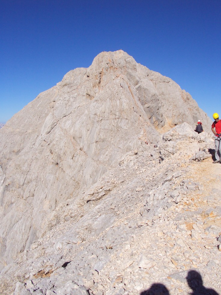 Risalito il primo zoccolo dirigiamo decisi verso il primo pilastro dove corre la ferrata – soliti fittoni e poi sul ripido cominciano i cavi. Le attrezzature guidano a girare il versante a meridione. Alcuni tratti, più facili, sono dotati unicamente dei soliti, lucidi, fittoni. La frequentazione è talmente alta che le rocce dove passa la via di salita sono tirate a lucido, sembra marmo e la cosa non mi rallegra molto, resto sempre con il dubbio sulla tenuta delle suole. Procediamo. Le mie condizioni impongono soste panoramiche. Si raggiunge un’aerea cresta con bella attraversata in direzione della cima principale, c’è parecchia gente che sta scendendo nonostante siano le 10 di mattina.