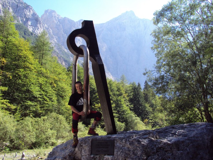 In verità più che il moschettone di 2m mi impressiona quello che ci sta dietro, la parete N del Triglav che si eleva maestosa per 1200m, senza parole.