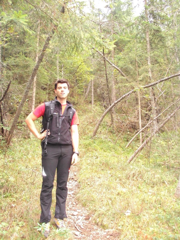 Noi oggi pace non ne abbiamo, come sempre del resto. Rido sotto i baffi a pensare che si parte sempre con quella di fare una tranquilla gita domenicale e trovarsi poi a una gara di corsa in montagna camuffata sotto abiti borghesi; aggiungiamo poi che oggi l’amico Pelle è stato svegliato dal mio telefono e che siamo partiti con 30  min di ritardo, ecco spiegata l’andatura della restante ora successiva. Ansimanti e fradici di sudore, per la corsa e per l’umido, oltrepassiamo il primo tratto di facile mulattiera e le successive serpentine su terreno via via più ripido e ghiaioso. Fra mughi particolarmente odorosi di questo periodo, larici ancora verdi e una zona di piante schiantate al suolo per valanga o tromba d’aria chissà, guadagnamo velocemente quota.
