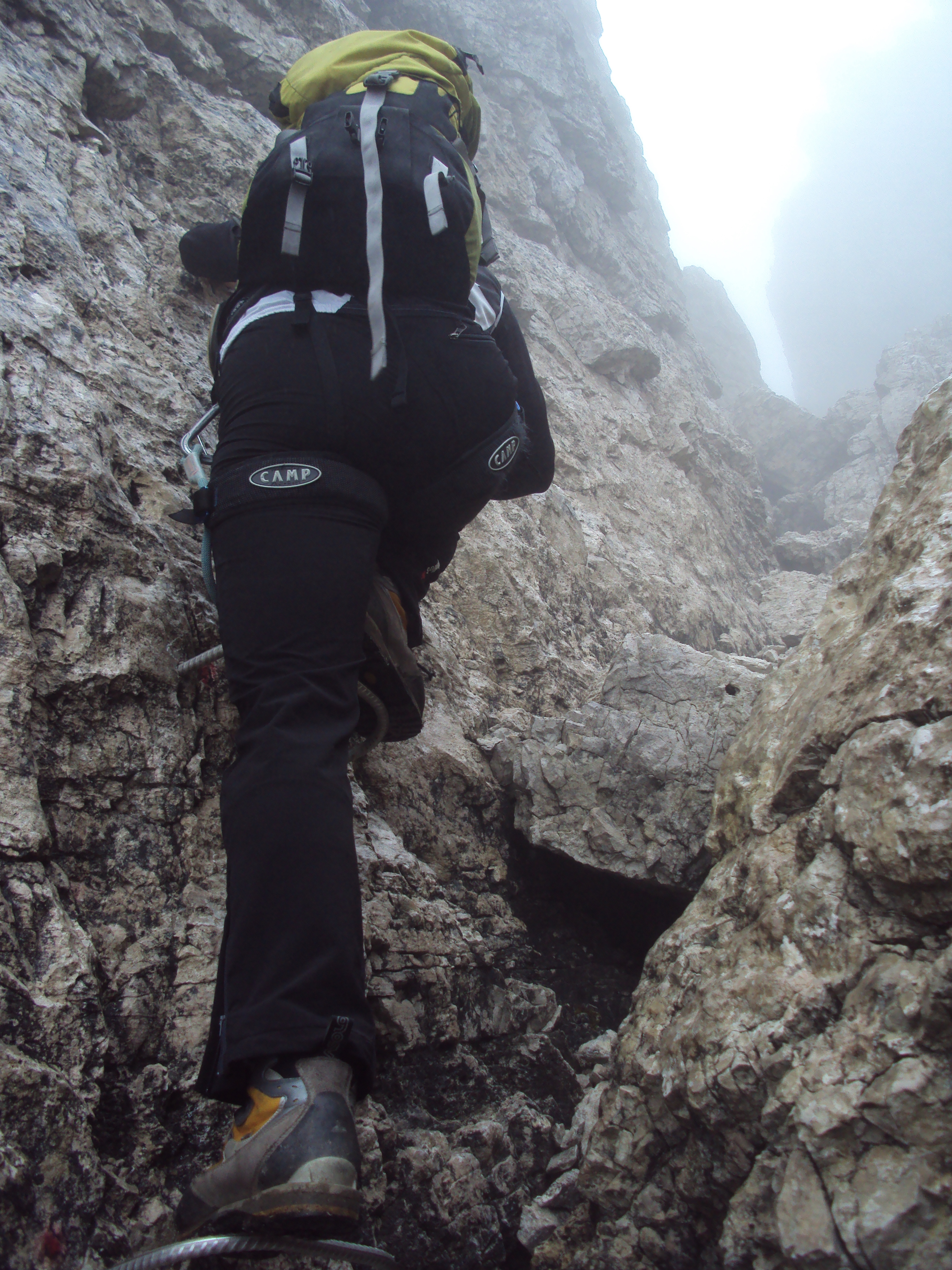 Ci imbraghiamo, la ferrata dovrebbe iniziare a breve. Seguiamo quindi delle tracce su ripidi che portano a un primo ballatoio da dove parte il primo cavo; la salita è semplice, si e no di I°. Non si vede un fico secco.