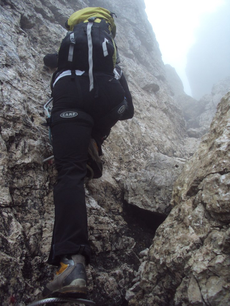Segue un alternarsi di balze, terrazzoni di ghiaia e attrezzature, sempre su modeste difficoltà. Si aggira tutta la dorsale verso destra fino ad incunearsi in alcuni canali detritici dove sono presenti 2 tratti più atletici che guidano al facile spallone finale; dove necesario sono state ancorate anche delle zanche per agevolare la salita. Si ride e si scherza.. Verso la cima si attreversa una dorsale con delle profonde fessure di cui non si intuisce il fondo, fenomeni geologici impressionanti che lasciano esterrefatti. Arriviamo alla cima senza rendercene conto, se non per un grosso ammasso di sassoni a cui contribuisco posandone un altro.