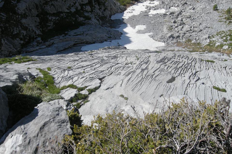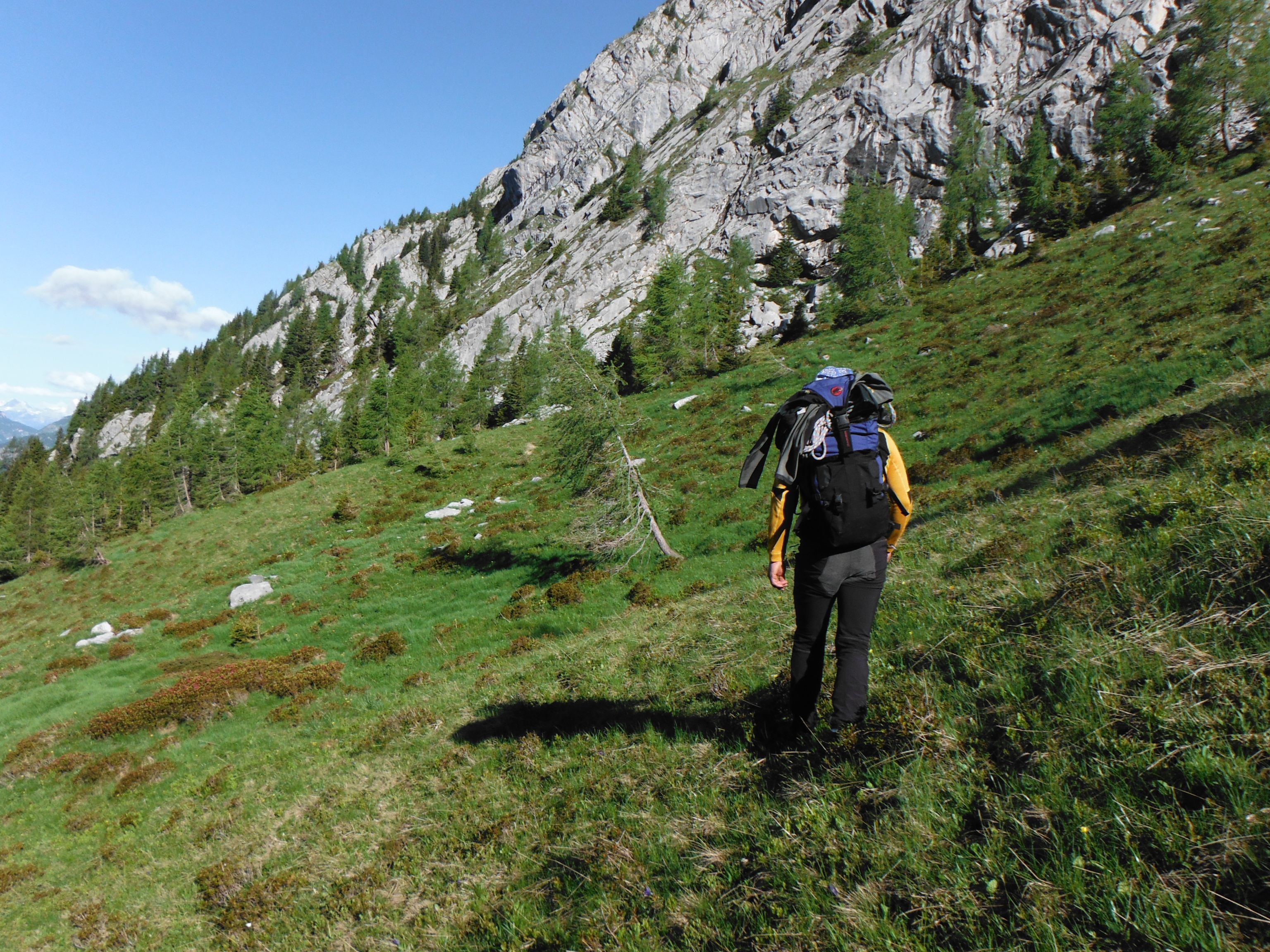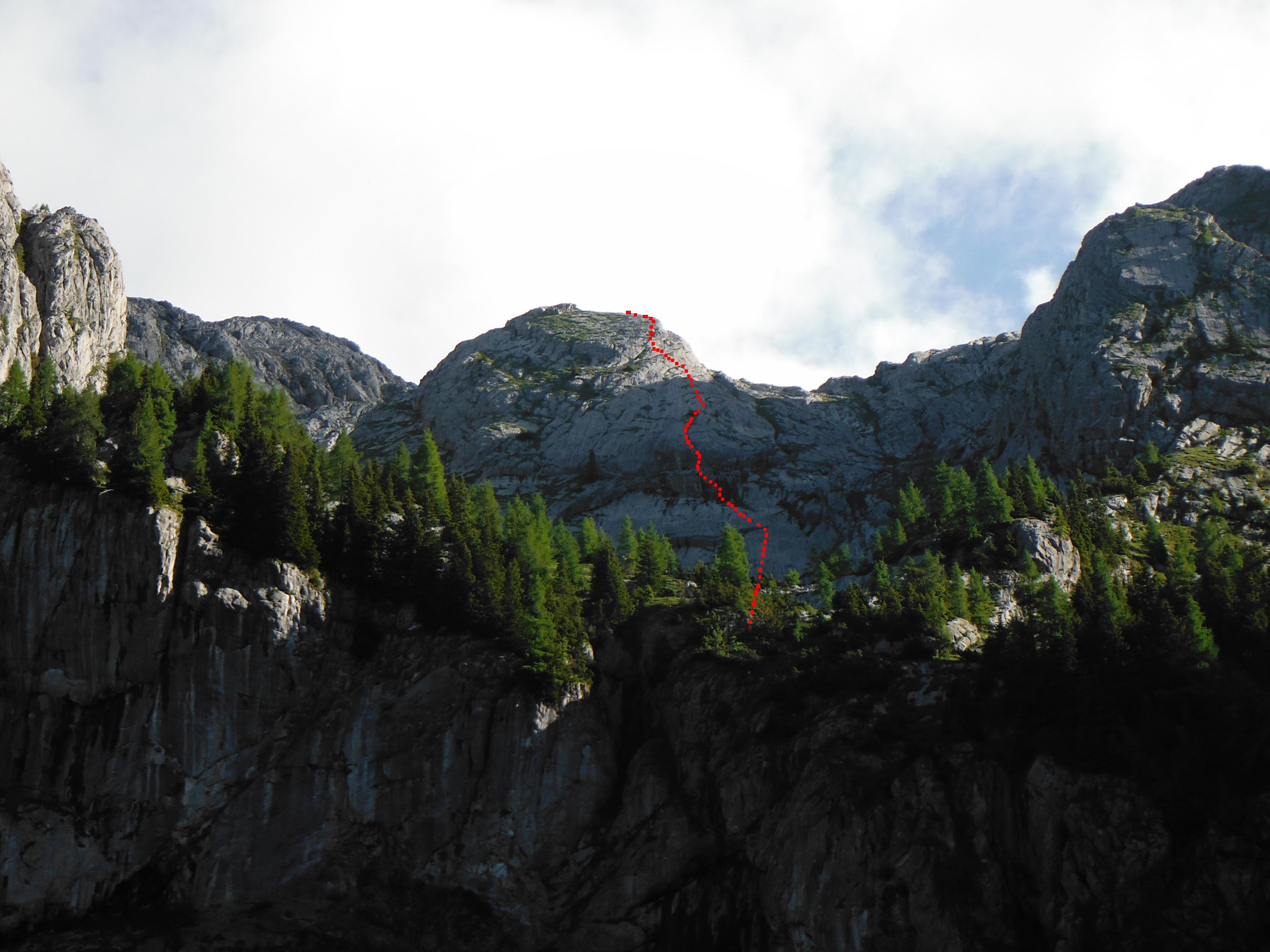 Accediamo alla magnifica conca attraversando in quota per piccoli abeti e grossi formicai, fino ad intercettare sulla dx il punto debole del versante costituito da un canalino terroso su cui ci issiamo sbucando in vista delle placche dove corrono le vie. Sembra di passare il confine e di entrare in un altro Mondo, sono estasiato.