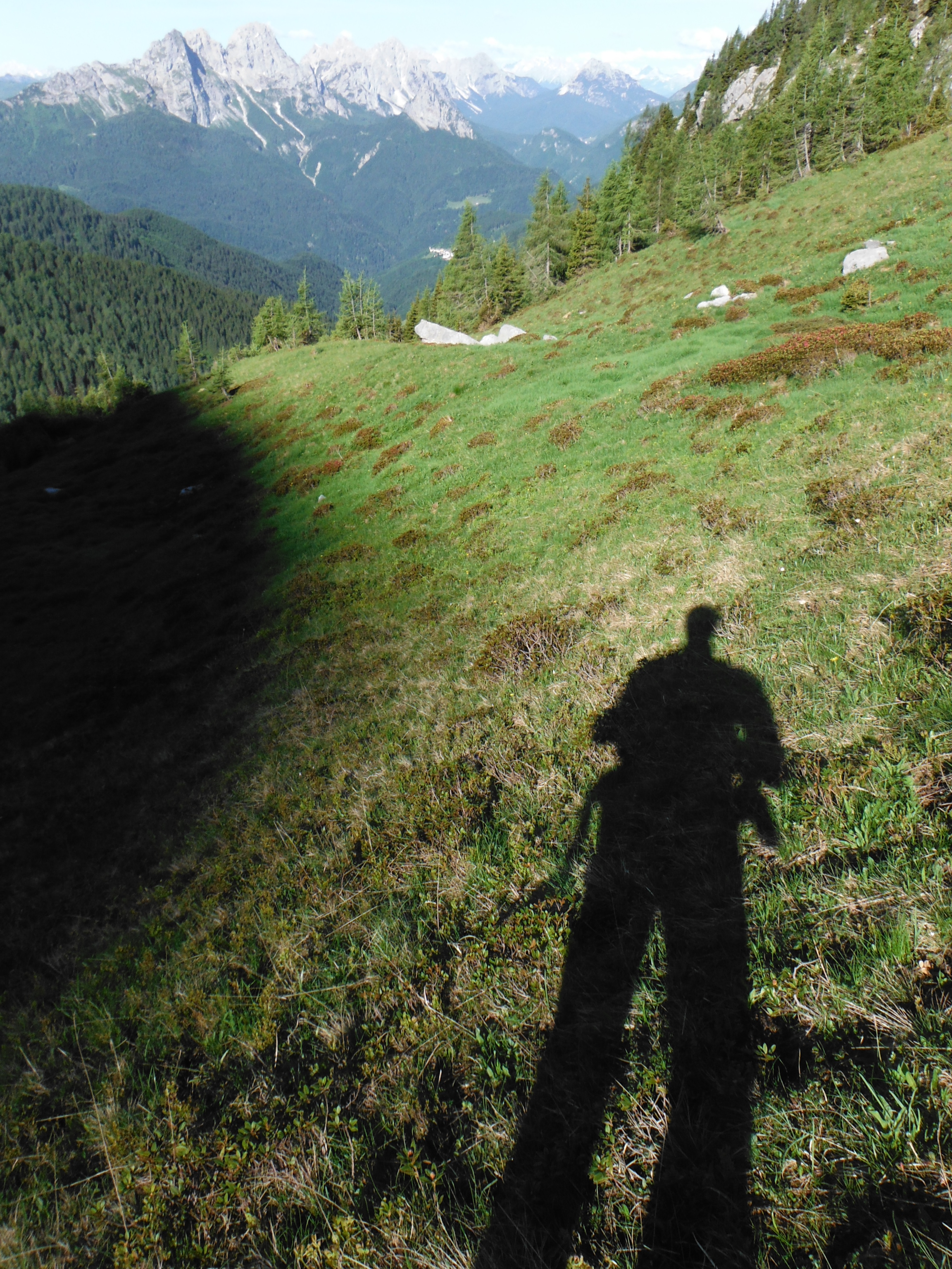 L’avvicinamento si compie dal parcheggio del Rif. Tolazzi fino al tornante successivo alla malga Moraretto, dove sulla sx fra ontani più o meno grandi e erbe fradicie guadagnamo i prati del vallone che scende dal Coglians sotto alla torre del Coston di Stella. Fa un freddo cane, in alto neve e sotto ai piedi la brina della notte. Il rigelo notturno mancato per tutta la primavera lo sta facendo ora che è quasi luglio, senza parole!