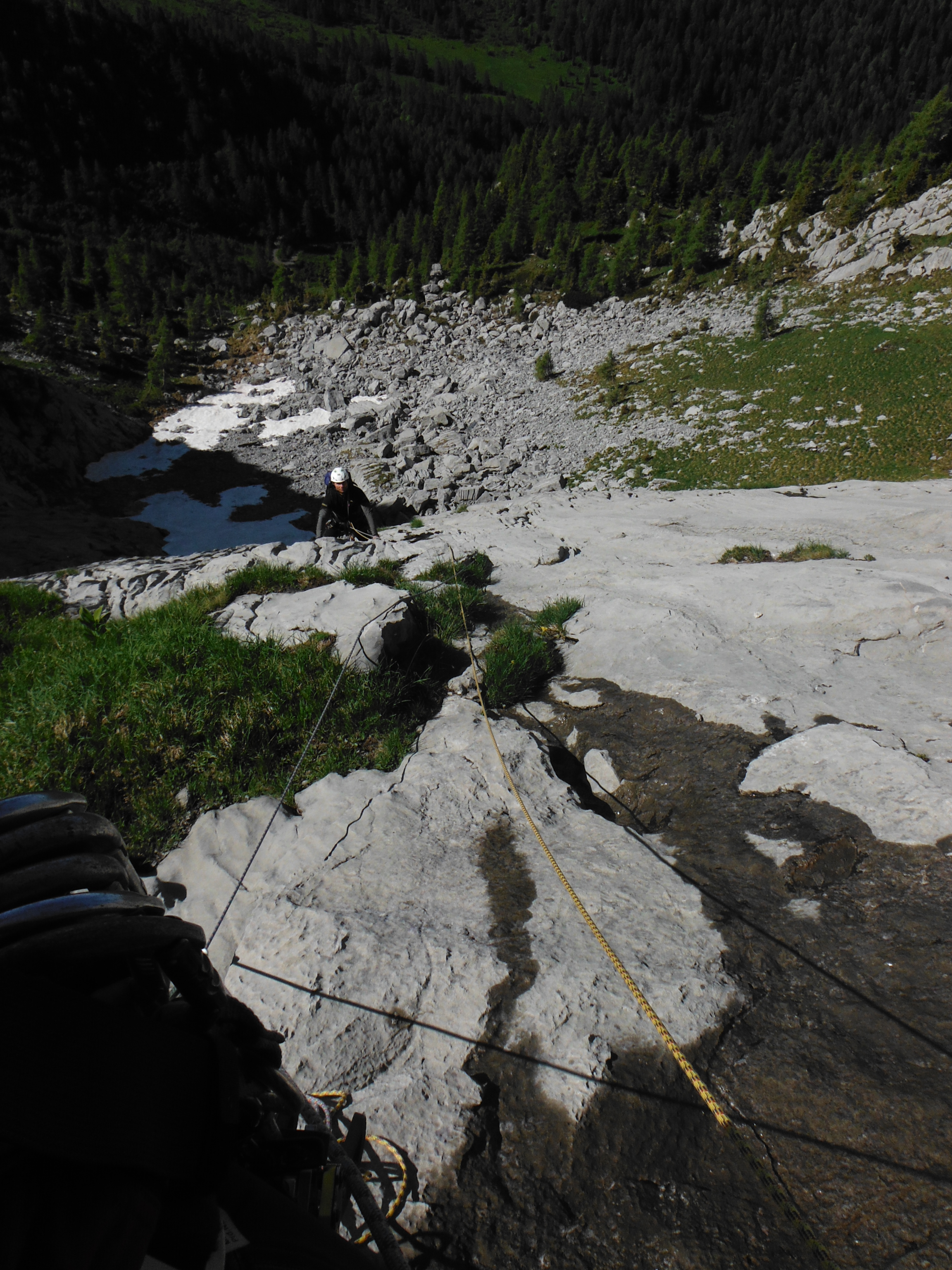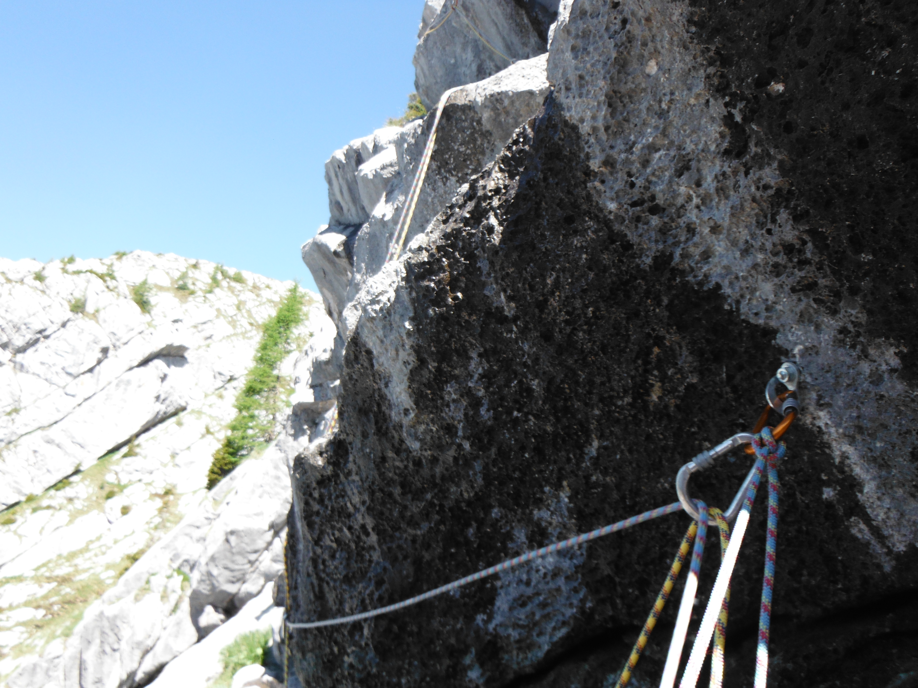 Ciò che mi aspetta dopo è la fessura che le relazioni danno come di VI°-. E’ subito sopra alla sosta e la protezione è in alto, troppo! Qualcuno deve averla pensata come me visto che aiuta la sicurezza un chiodo con Kevlar piuttosto provvidenziale! Il passaggio è strano, con prese rovesce e panzetta liscia per i piedi.. Un pò alla volta si guadagnano i cm, quindi lo spit e quella che sembra l’uscita dal tosto. Poi però di passaggio delicatino ce n’è un altro prima della sosta e lo proteggo con un altro frend. La sosta è comoda come quella sotto, con doppio spit e vecchio cordone sbiancato di collegamento. Ormai è fatta, sopra si slancia una bella piramide appoggiata di rigole d’erosione, una favola che si salirà Angelo da primo, che invidia!
