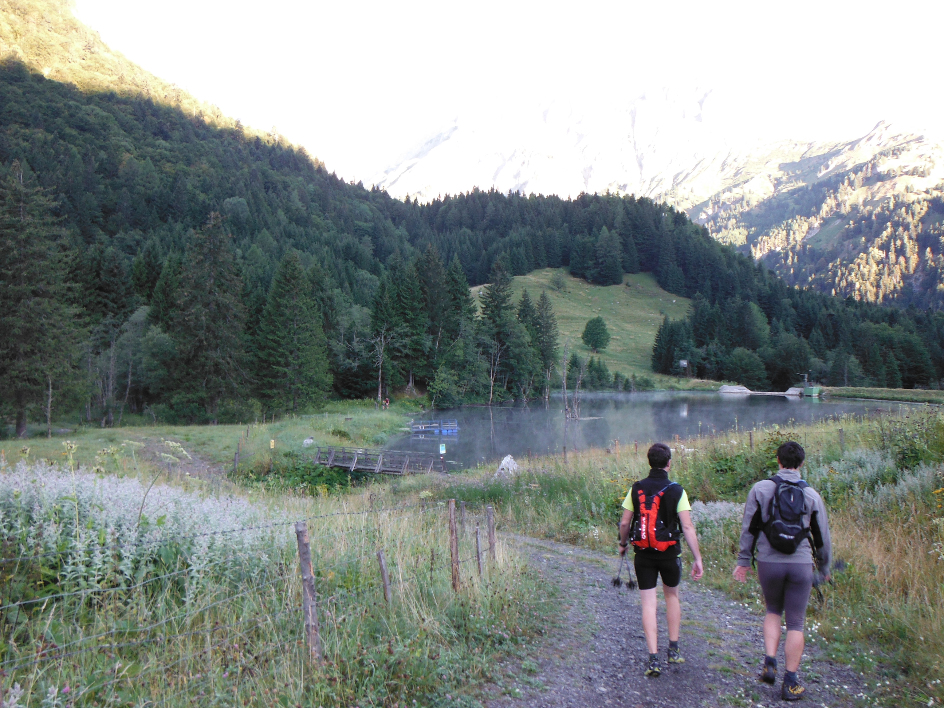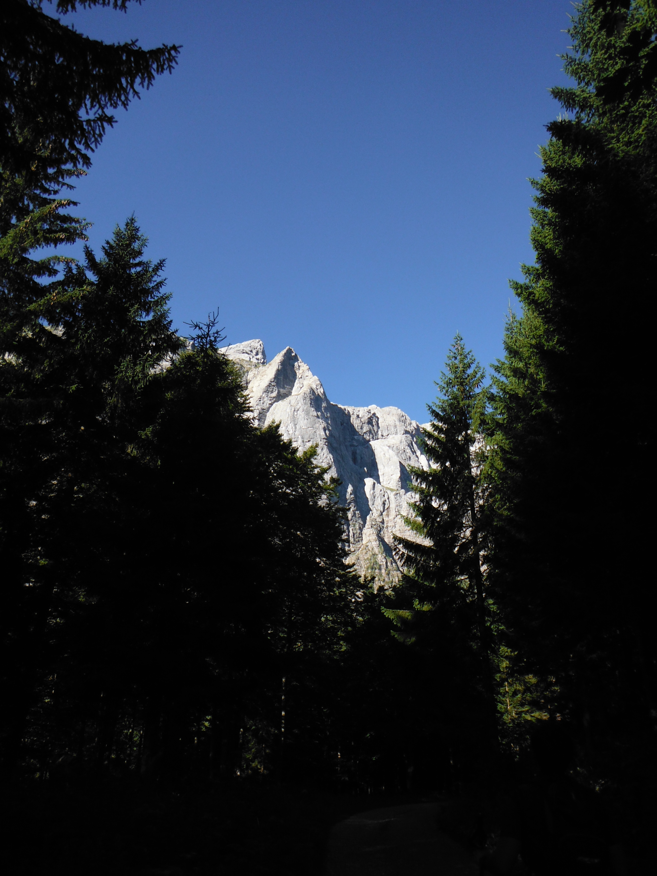 Partiamo alle 7.02 dal piazzale del passo monte Croce Carnico, delle temperature africane dei giorni scorsi neppure l’ombra. Solo una maglia a maniche lunghe consola un pò e il passo si fa spedito giocoforza lungo la galleria in discesa verso la Plochen Haus per tenerci caldi. Già porto le conseguenze della serata trascorsa all’aperto dopo un crollo delle temperature di 20°, e il mal di gola che mi accompagna non è un buon presagio. Ma i paesaggi di questo lembo di Carinzia sono talmente belli che la mente non pensa nè al freddo nè al mal di gola, solo alla fortuna di poter vivere questi attimi e queste avventure in formato mignon. Passando nei pressi della riva del piccolo laghetto artificiale incrociamo 2 ragazze con degli zaini himalayani sulla schiena, sguardi truci e portamento da boscaiolo, che dure!