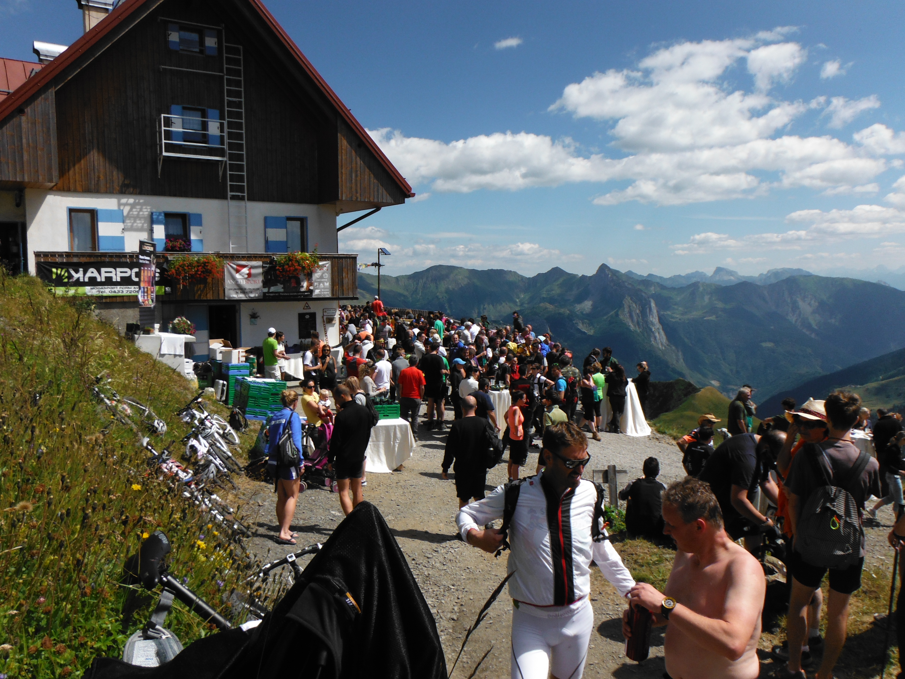 Girato l’angolo è la bolgia, la mattina Ieppe diceva che oggi ci saremmo imbattuti nella manifestazione “scollinando” con sede al rifugio ma non credevo fosse una cosa del genere! Il piazzale è pieno di personaggi di tutte le età e di ogni categoria. Non faccio in tempo a rendermi conto di quel che succede che subito una ragazza mi mette al collo un porta calice col simbolo della manifestazione.. Mi giro e c’è un bancone dove vendono occhiali pacchiani fosforescenti con le infradito in coordinato.. Al Marinelli?? e allora io che sono vestito come sempre da 15 anni a sta parte sono fuoriluogo, con i miei pantaloni della montura da trekking, pagati ai tempi 50 € e che dovrebbero essere in pensione ormai da parecchi anni? Nel piazzale il controvalore in abbigliamento Montura sarà di qualche decina di migliaia di €, al contrario del mio vestiario quello sfoggiato dagli astanti è lucido e splendente, sembra appena uscito dai magazzini dei negozi sportivi.